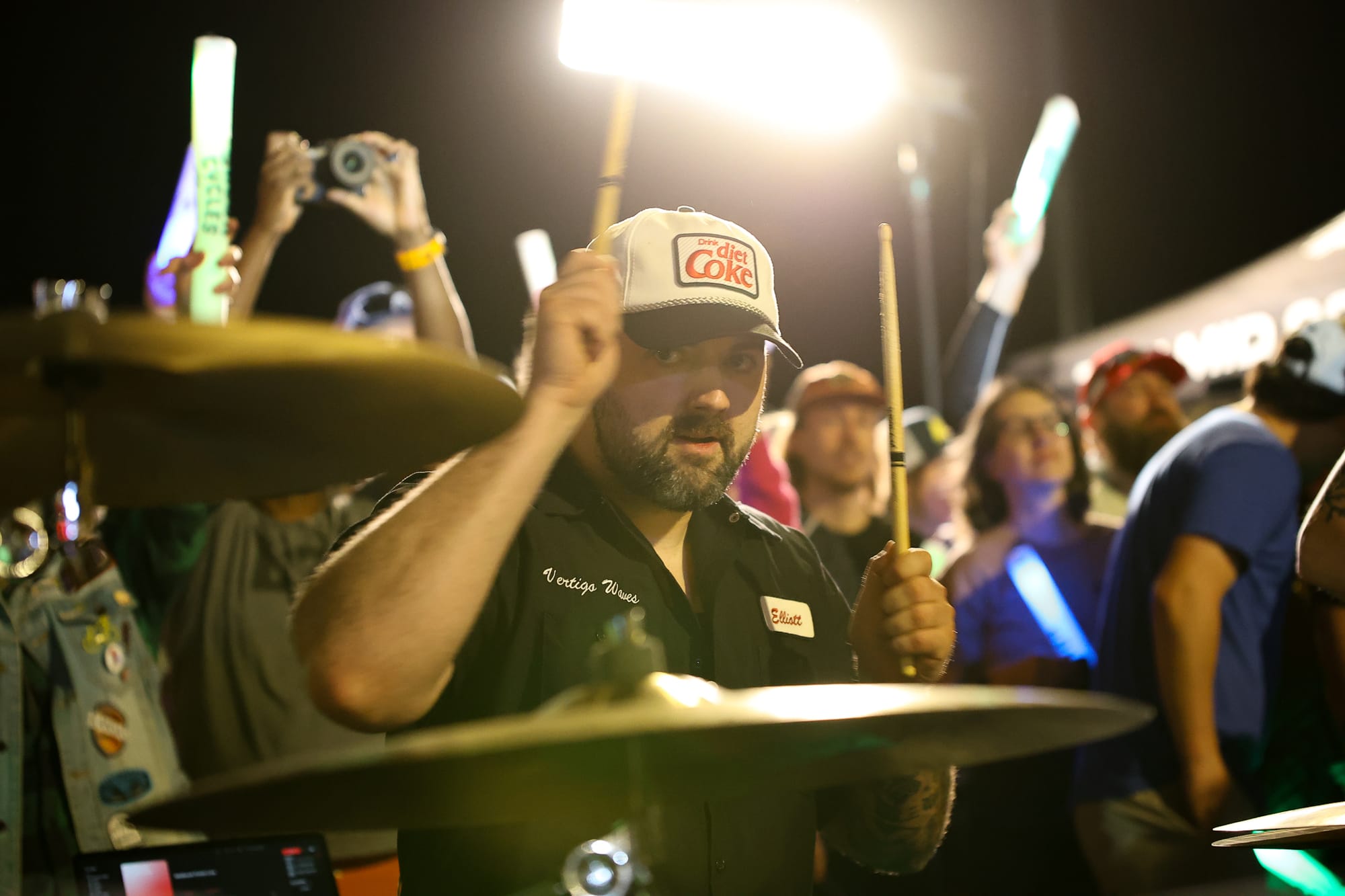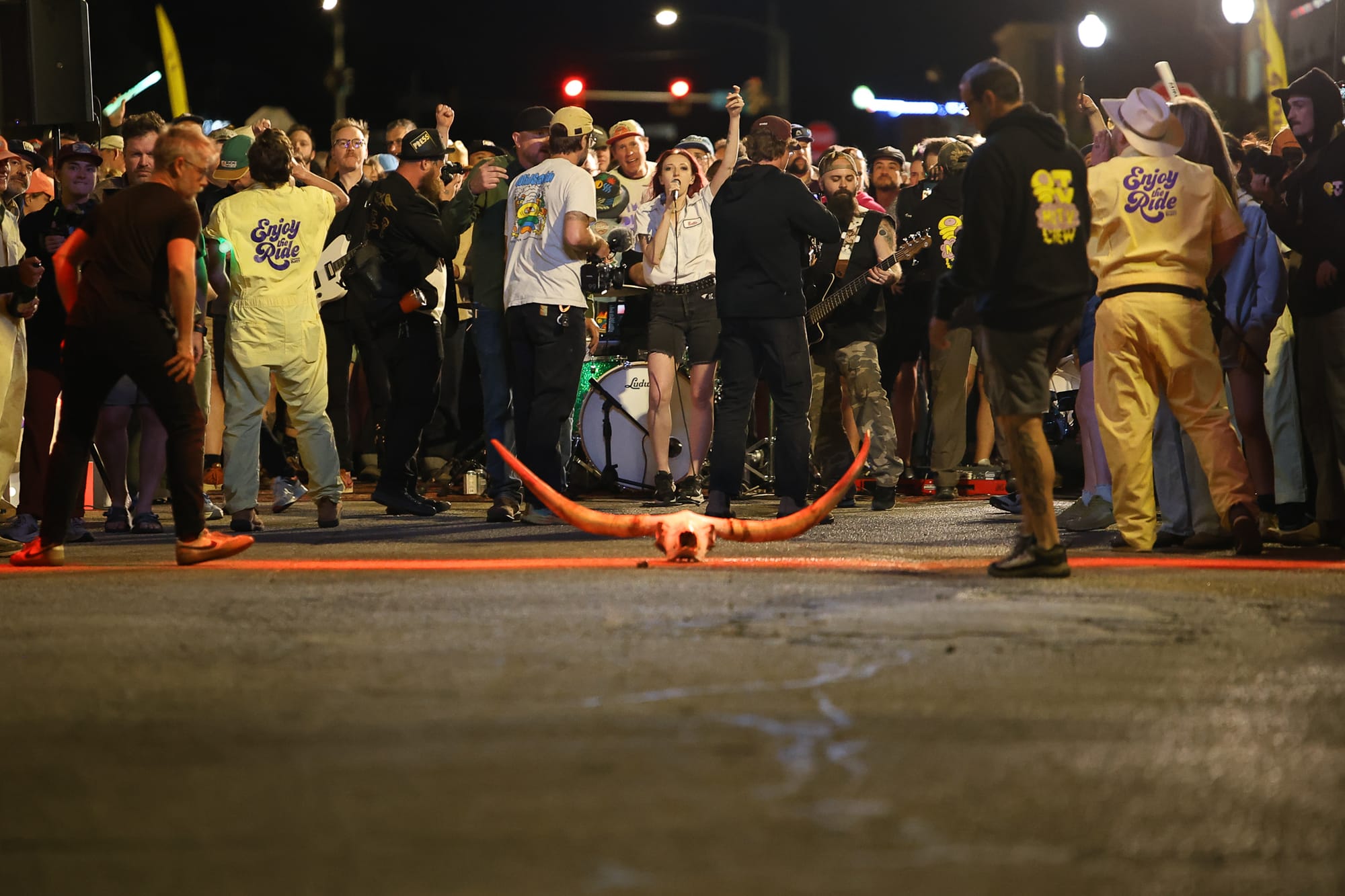 On Saturday, after completing their main set on the Kicker Soundstage at Block 34, the band moved their equipment to the finish line chute. They set up a rug in the middle of the road and played on, covering other songs while the crowd waited. When Jeep headlights appeared in the distance — a signal that Owenreay was making her final approach — the band launched into "DFL." Surrounded by a cheering, dancing crowd, with cameras rolling, Owenreay came down the chute.