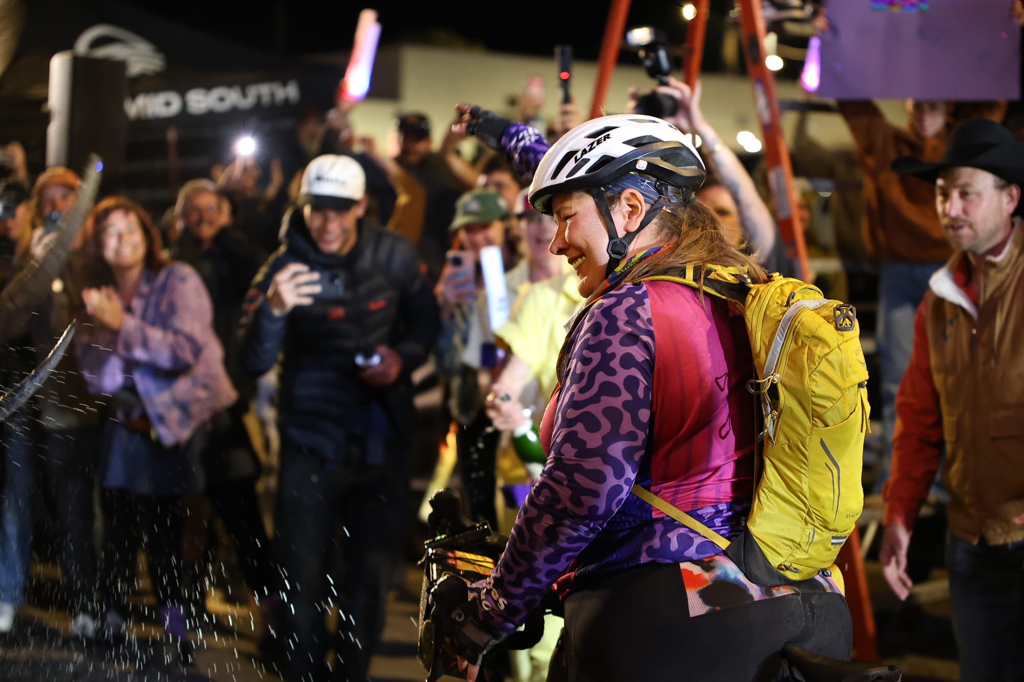 Kristen Owenreay laughs as champagne rains down on her at the Mid South finish line in the moments after completing the 106.2-mile amateur race (top left). Owenreay takes in the scene as the crowd Bobby and Crystal Wintle have built around the DFL finish surrounds her with cheers and phone cameras while champagne continues to fly (top right). Owenreay poses with Mid South co-founder Bobby Wintle, whose commitment to celebrating every finisher — first to last — has made the DFL arrival one of the most anticipated moments of the entire race weekend (bottom left). Crystal Wintle smiles while holding a bouquet of wildflowers gathered for Owenreay, a reflection of the personal touches the Wintles have woven into the DFL tradition (bottom right). – Photos by Chris Peters