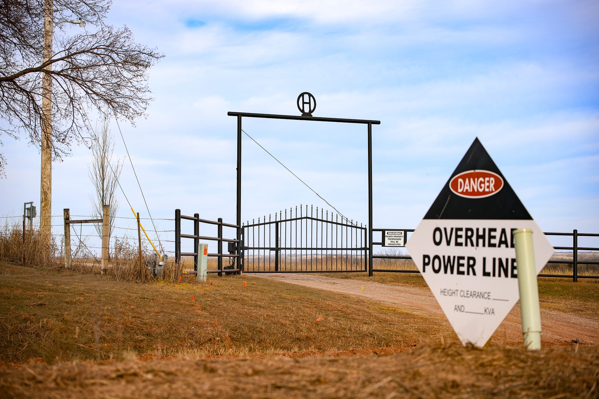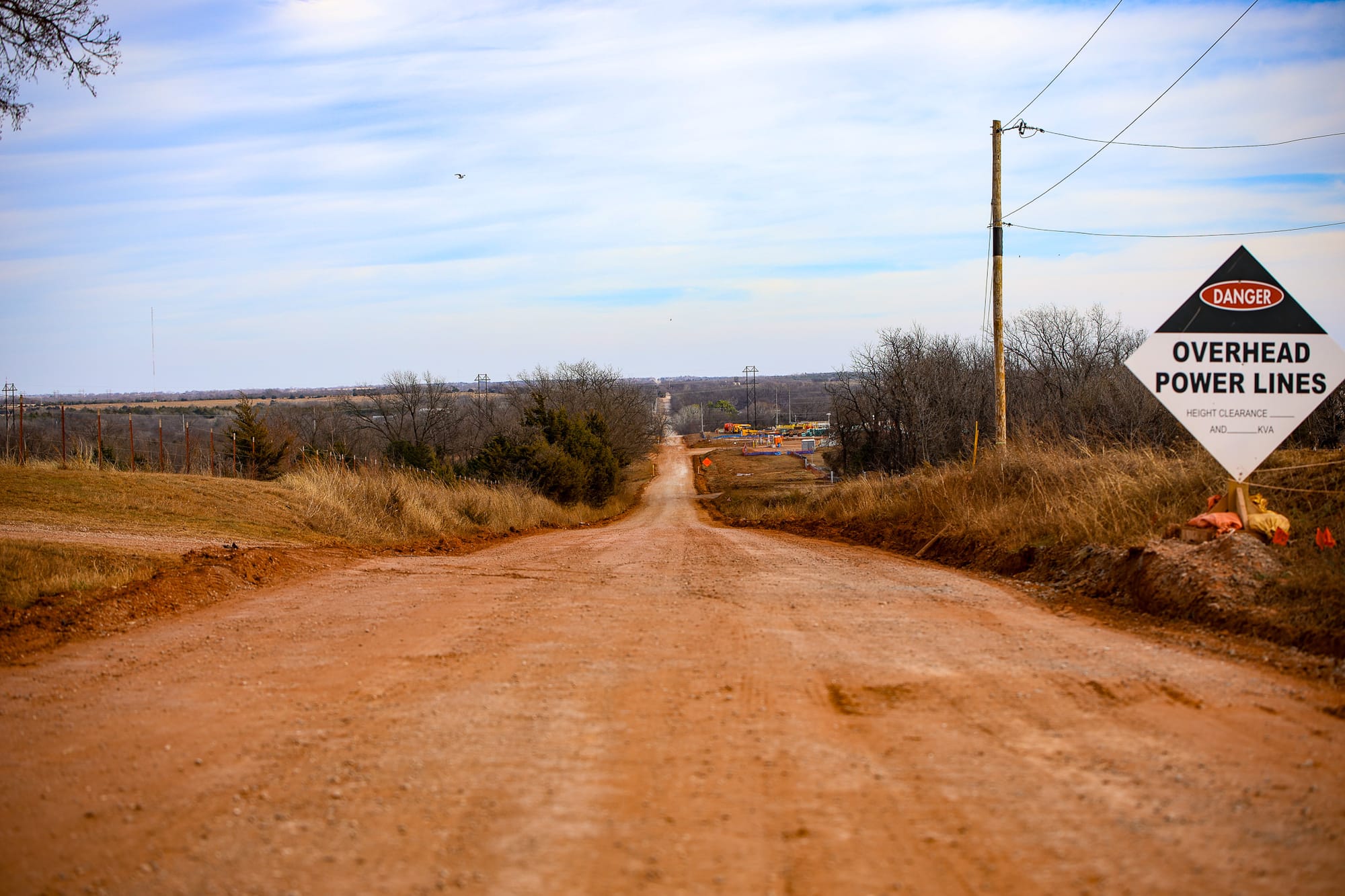 Google's data center campus on Dec. 24, 2025: the gated entrance to Crystal Hayes' ranch on Richmond Road, overhead power line warnings along the unpaved route, and construction progress on the Phase 1 building in Tax Incentive District 1. – Photos by Chris Peters