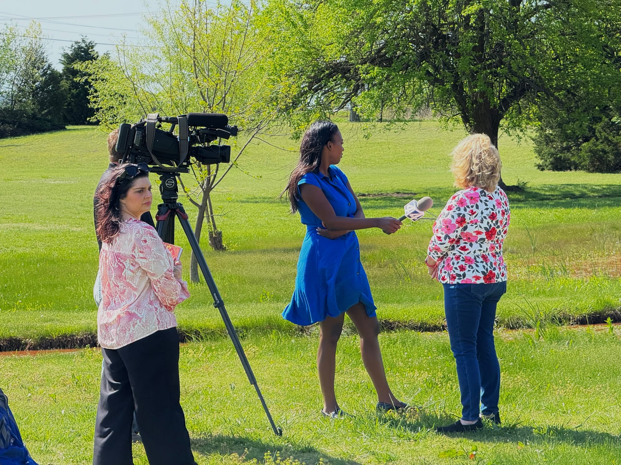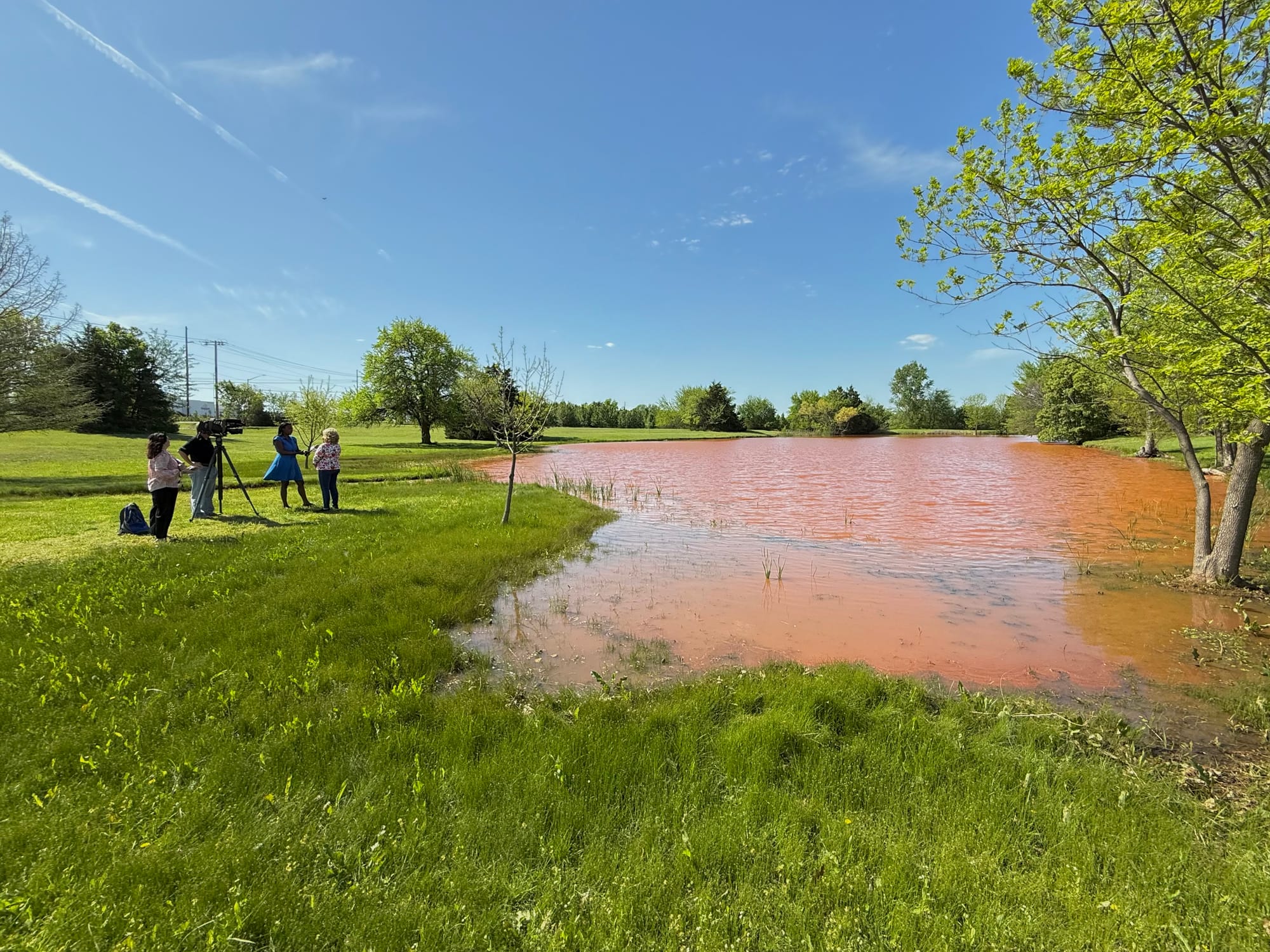 Dead fish, reddish-brown water, and KFOR Channel 4 interviewing Park View Estates residents after spring rains washed construction runoff from the Google data center site into their pond, April 22, 2025. – Photos by Chris Peters