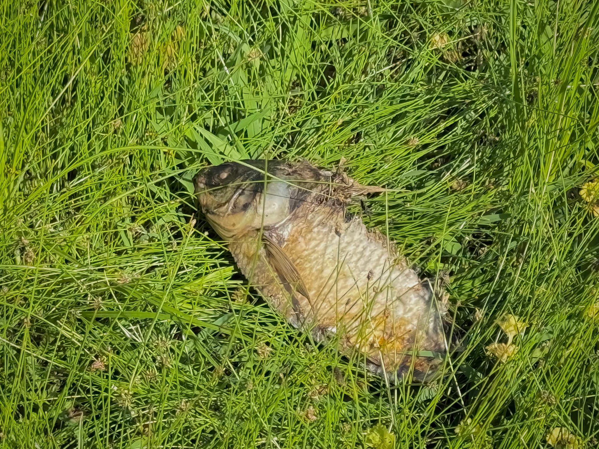 Reddish water and dead fish