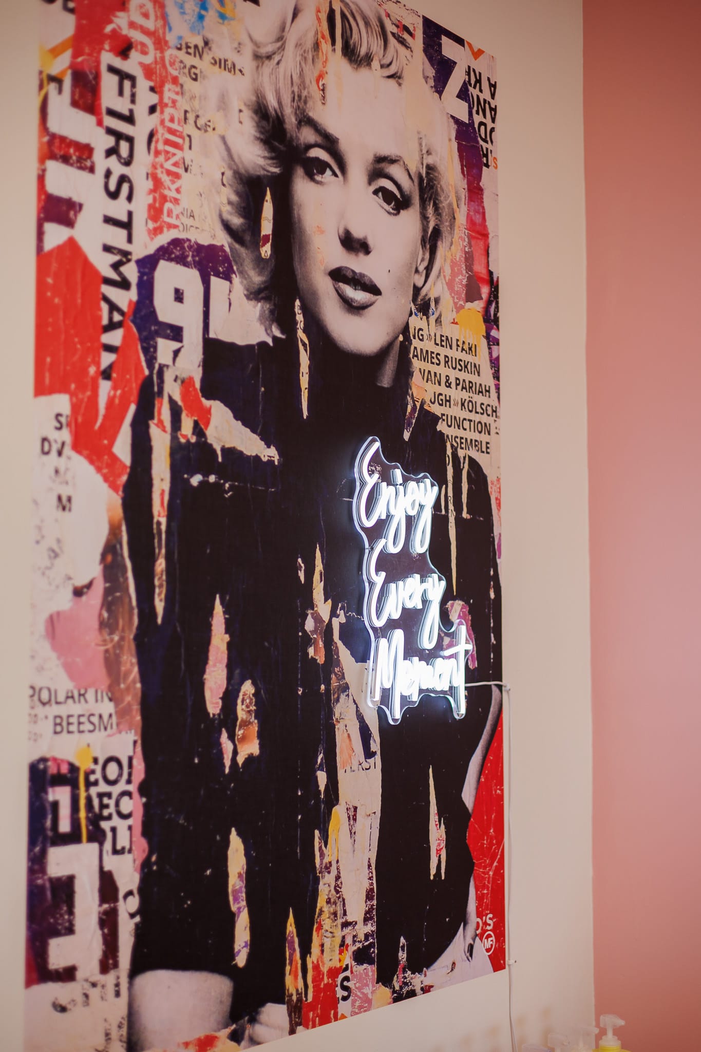 Owner Amber Fladie decorated Blown & Bronzed herself. A pop-art collage with a neon "Enjoy Every Moment" sign (left) and the salon's waiting area (right) capture the mix of bold and comfortable that defines the space. – Photos by Chris Peters