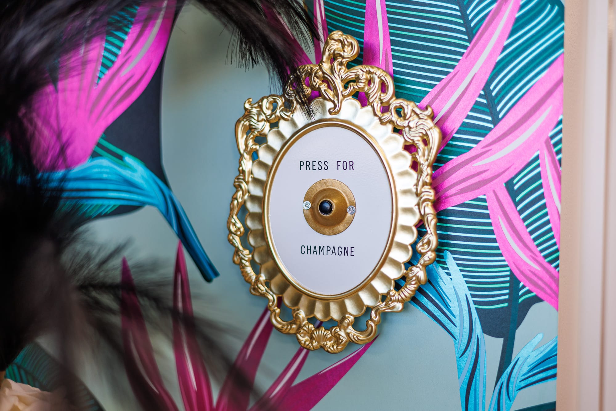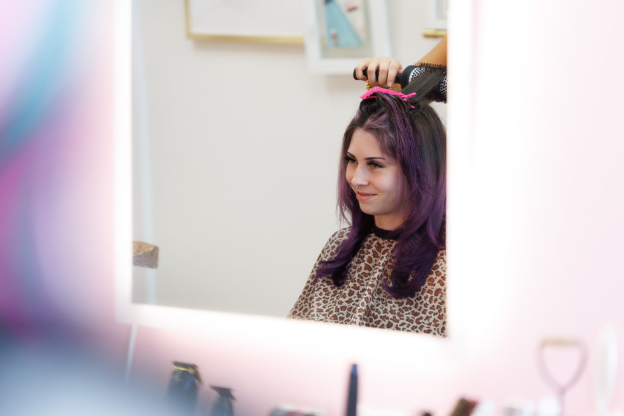 Blown & Bronzed owner Amber Fladie presses the salon's "Press for Champagne" button (top left and top right) and styles Haleigh Mckinzie's hair (bottom). The salon's pink walls, gold shelving and bold tropical wallpaper set the tone for the space Fladie decorated herself. Champagne and wine are available for clients 21 and older. – Photos by Chris Peters
