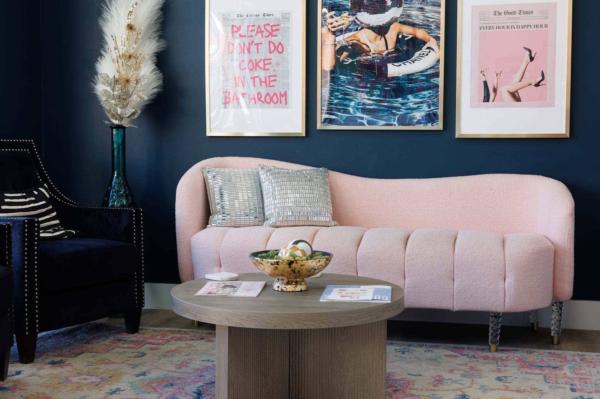 The salon's look is bold on purpose. Pink walls, edgy decor, a champagne button by the coffee bar for clients 21 and older. Fladie decorated the space herself, and the aesthetic reflects the personalities of the women who work there.