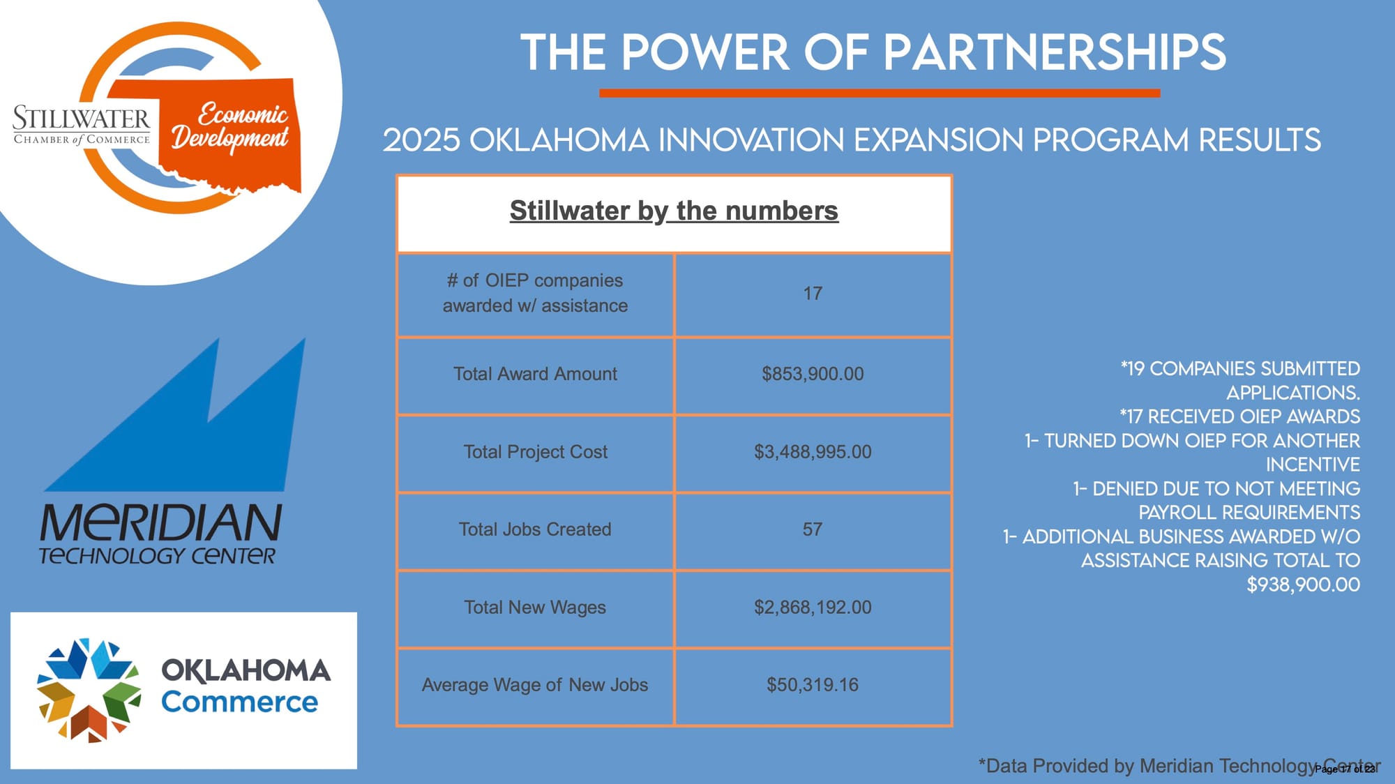 Of the 19 companies that submitted applications with Chamber assistance, 17 received awards while one turned down the state program for another incentive and one was denied for not meeting payroll requirements. An additional business received funding independently, bringing Stillwater's total awards to $938,900.