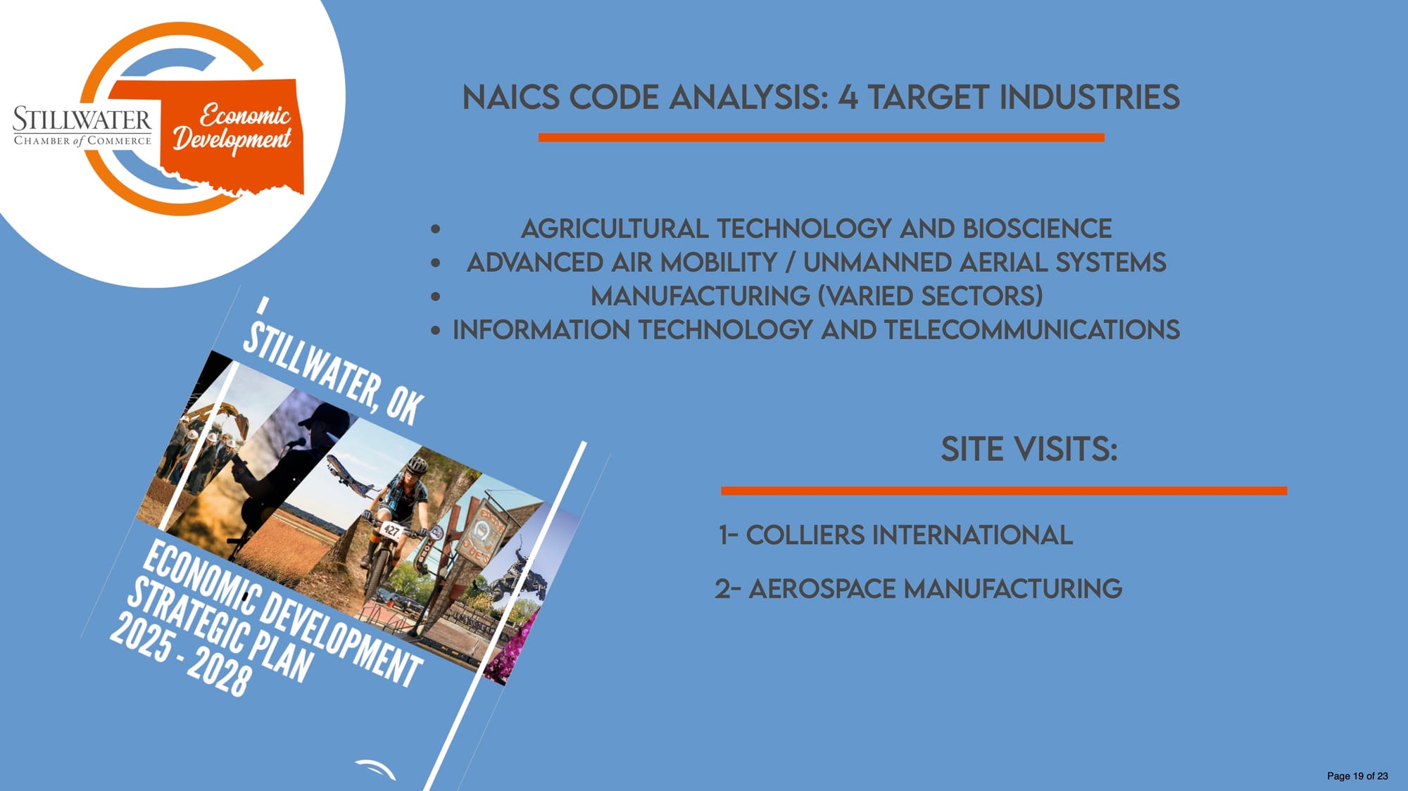 The Chamber has completed a strategic plan for economic development that targets four key industries based on a North American Industrial Classification System code analysis. The target sectors include agricultural technology and bioscience, advanced air mobility and unmanned aerial systems, manufacturing in varied sectors, and information technology and telecommunications.