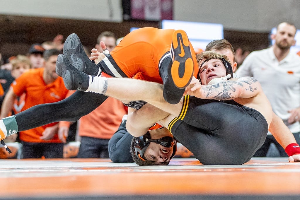 Three pins and four total bonus-point victories headlined the evening, as the Cowboys clinched seven of 10 bouts, en route to their first win against the Hawkeyes since 2019. Concurrently, OSU scored its most points in the series in its 60-dual history, winning Sunday’s meeting by its largest margin since 1961.