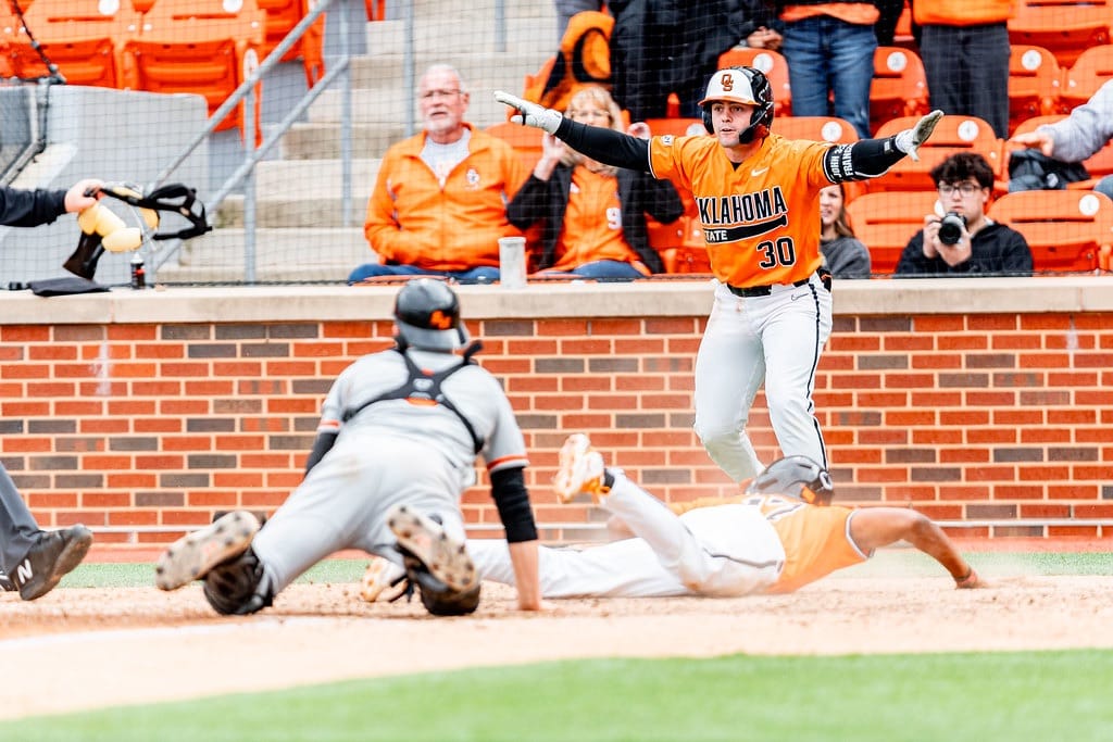 Moments later, Essex dove head-first toward home. The outstretched hands of Essex scraped the plate, evading the glove of Sam Houston State catcher Wes Baker with a classic swim move, scoring the go-ahead — and eventually, winning — run in Oklahoma State’s 1-0 win against Sam Houston State on Sunday at O’Brate Stadium.