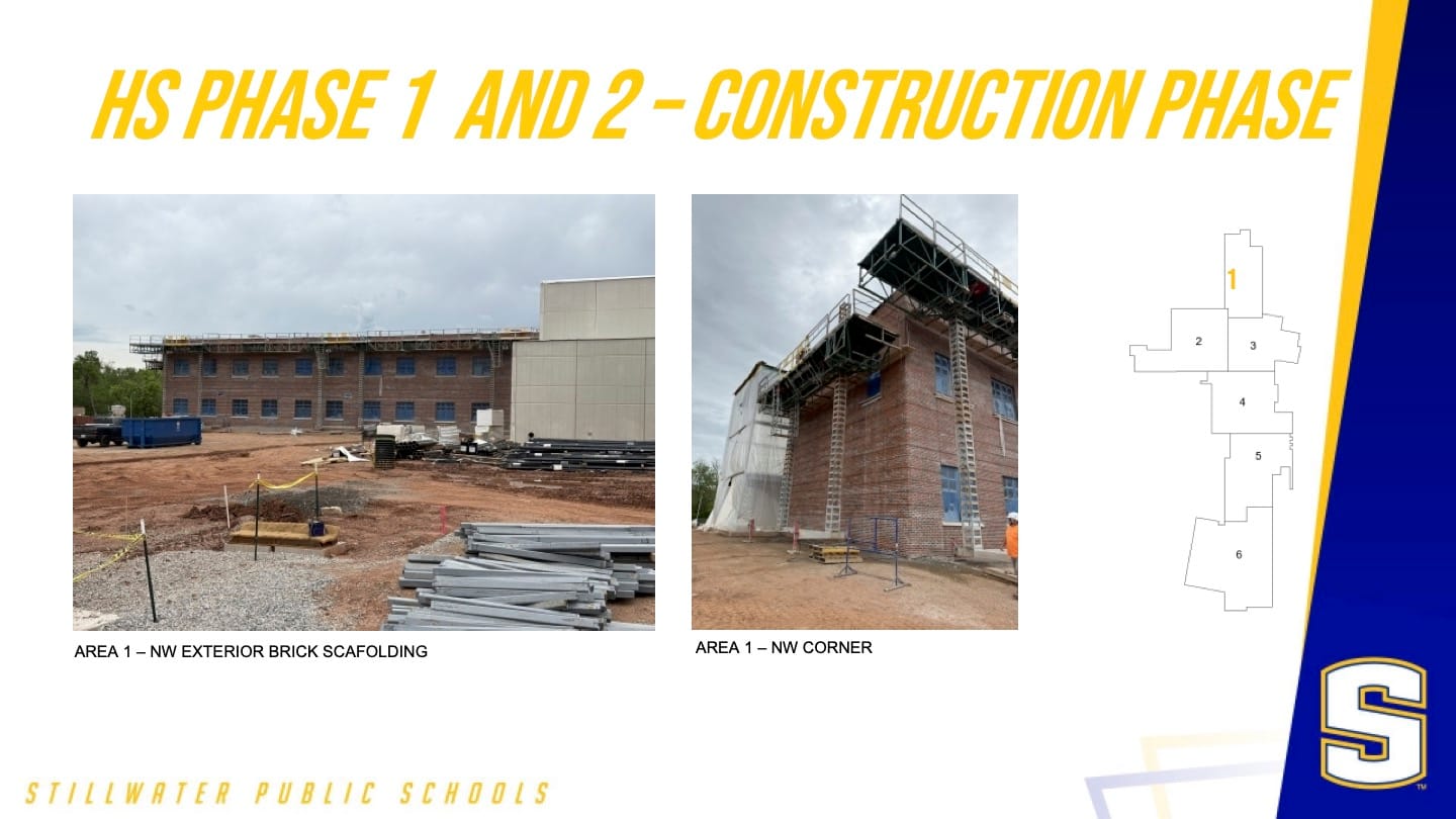 Thomas reported that the north wing's brick exterior is now complete, with interior drywall work progressing. The special education wing, visual arts area, student center, and performing arts wing are all taking shape.