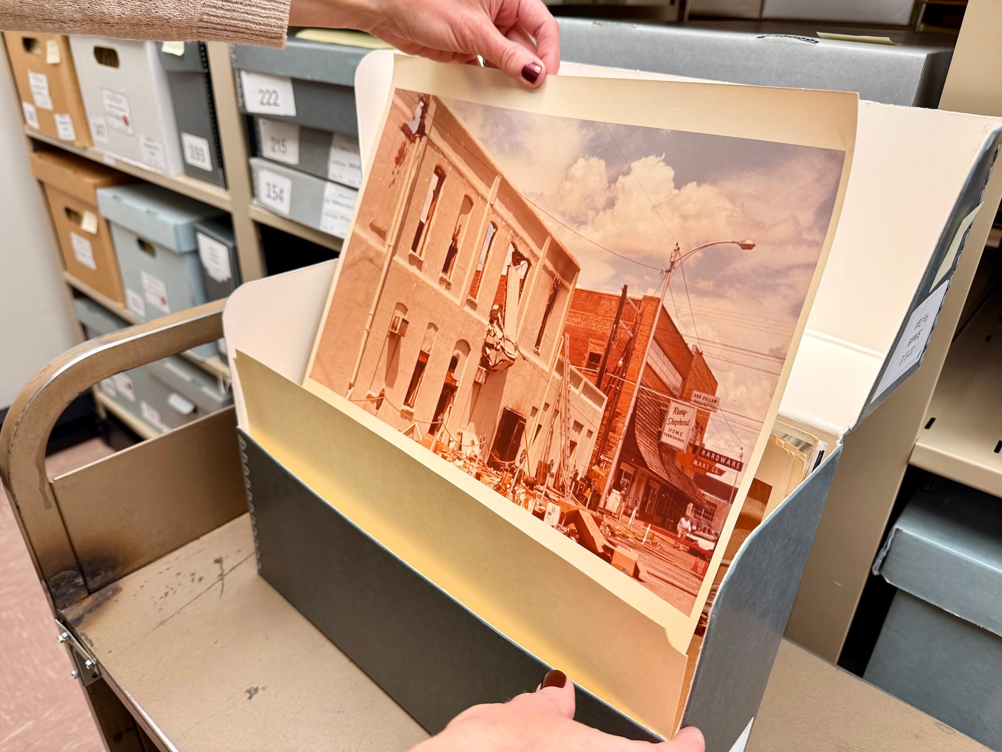 Technical Services Supervisor Andrea Kane holds a photograph of the building that once stood at the corner of 9th Ave. and Main St., now Chris Salmon Plaza. The photos are part of a collection given to the library by Fire Protection Publications, a department of the College of Engineering, Architecture and Technology at Oklahoma State University. – Chris Peters