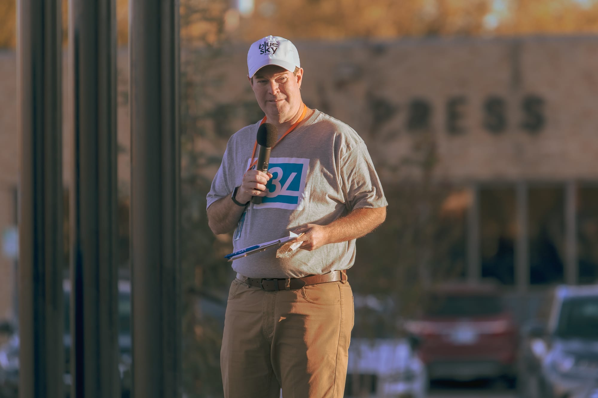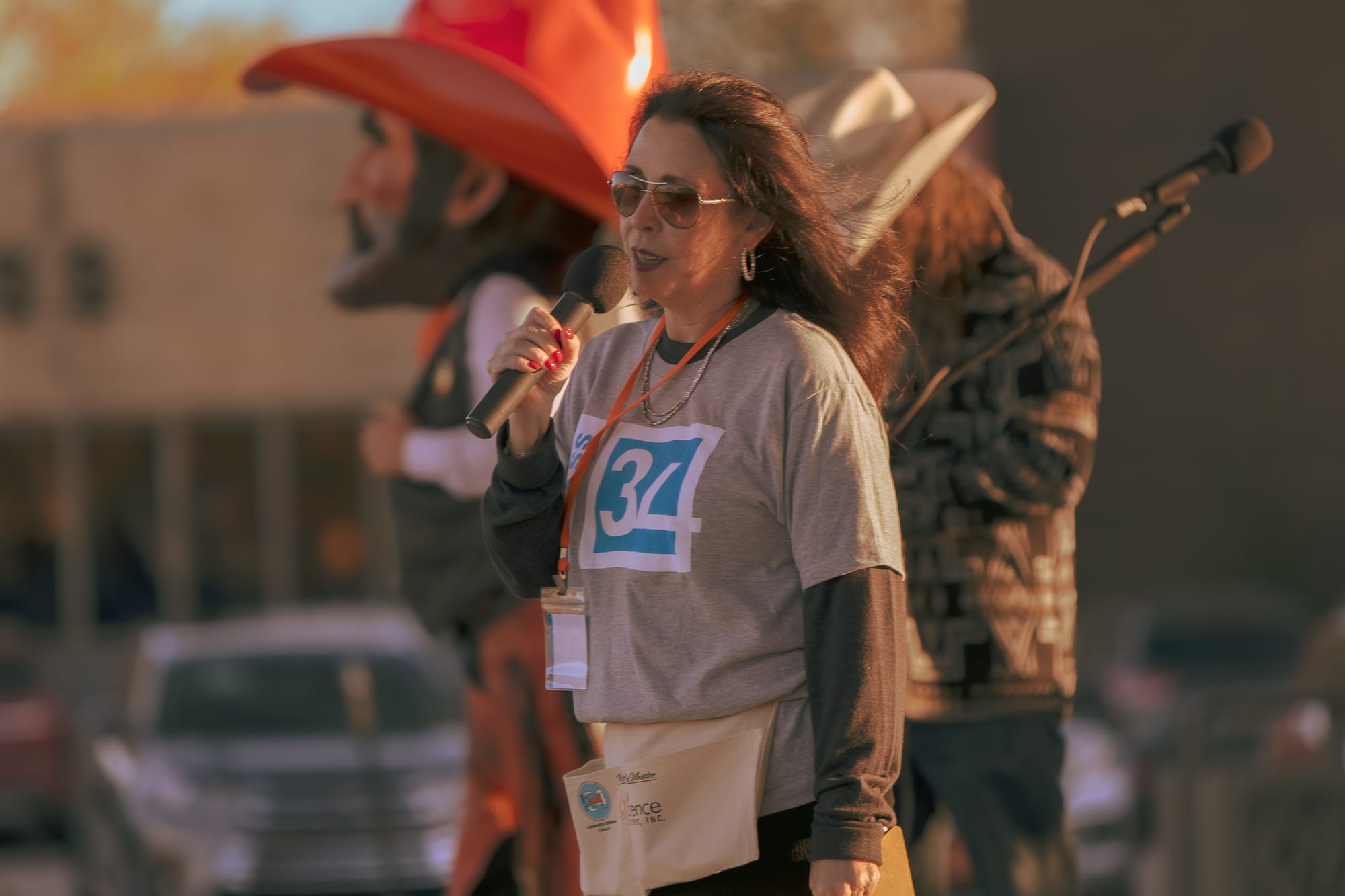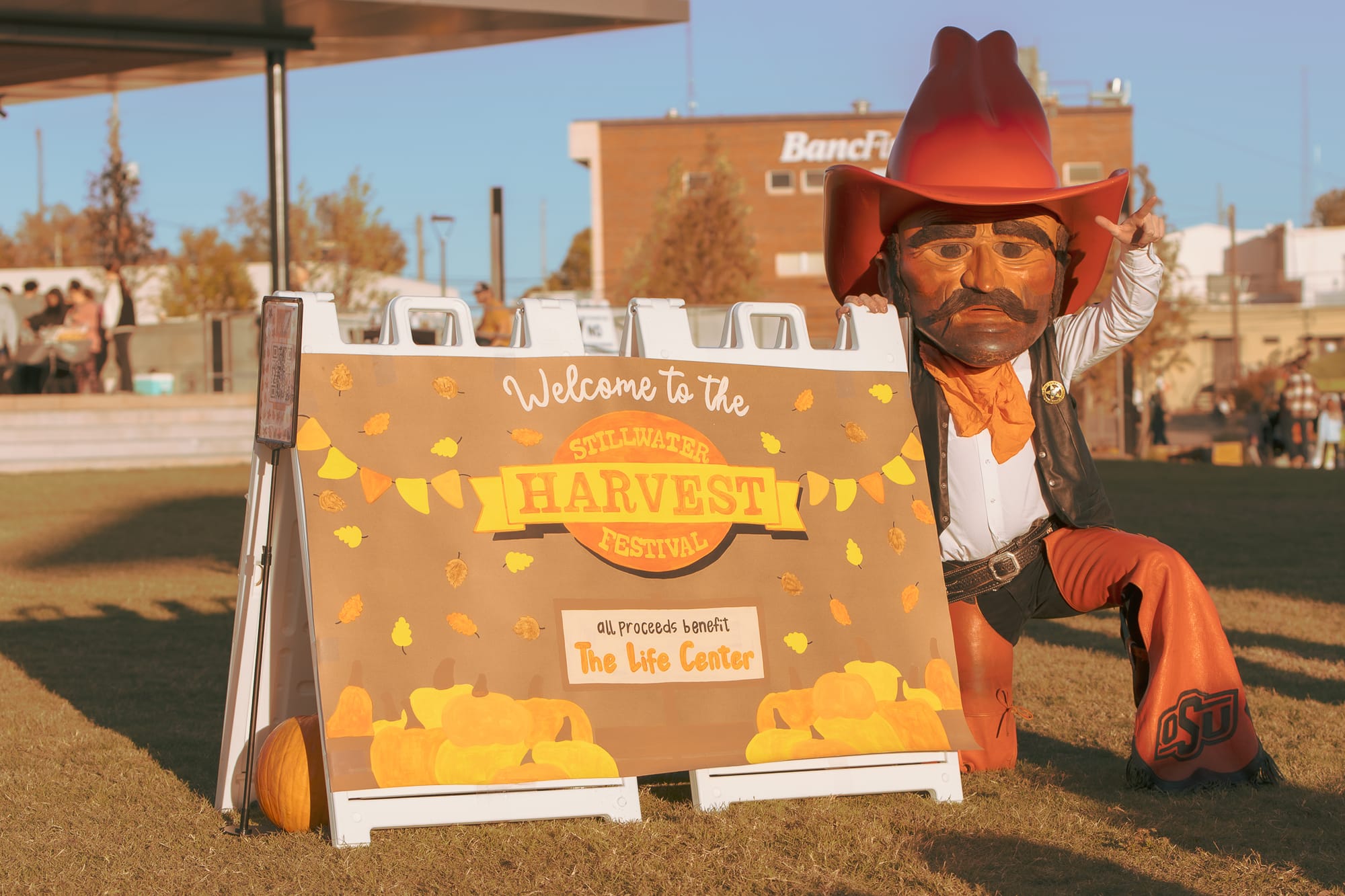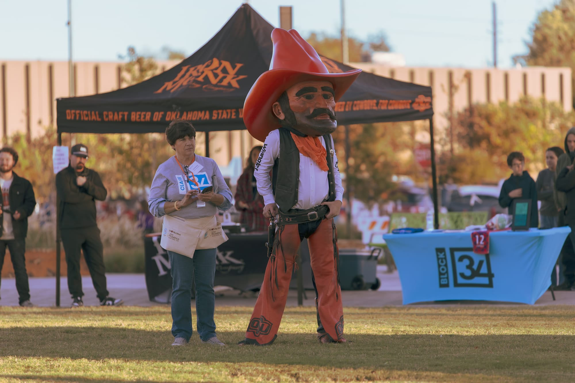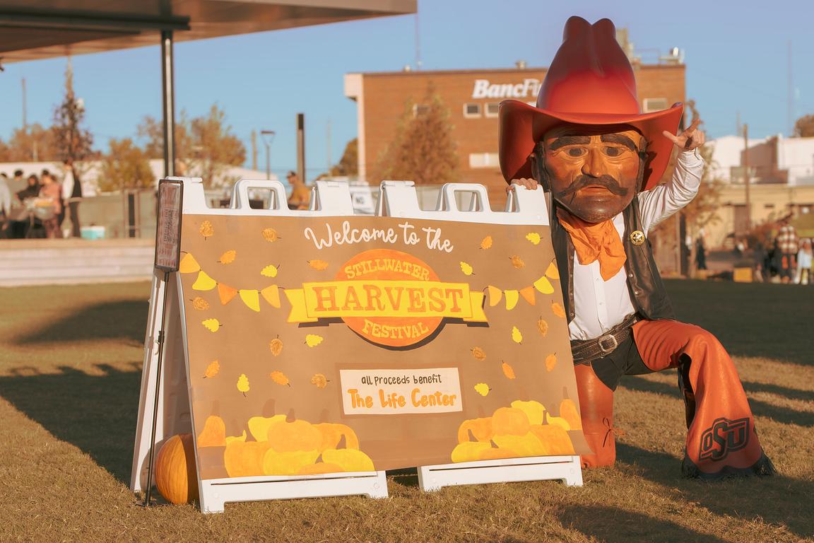 Pistol Pete greets festival-goers at the Stillwater Harvest Festival entrance, left, while emcees Starla Holcomb and James Bogg, both Leadership Stillwater Class 34 members, address the crowd during the fundraising event. Class member Page Provence watches the events on stage at Block 34 with Pistol Pete. – Photos by Chris Peters