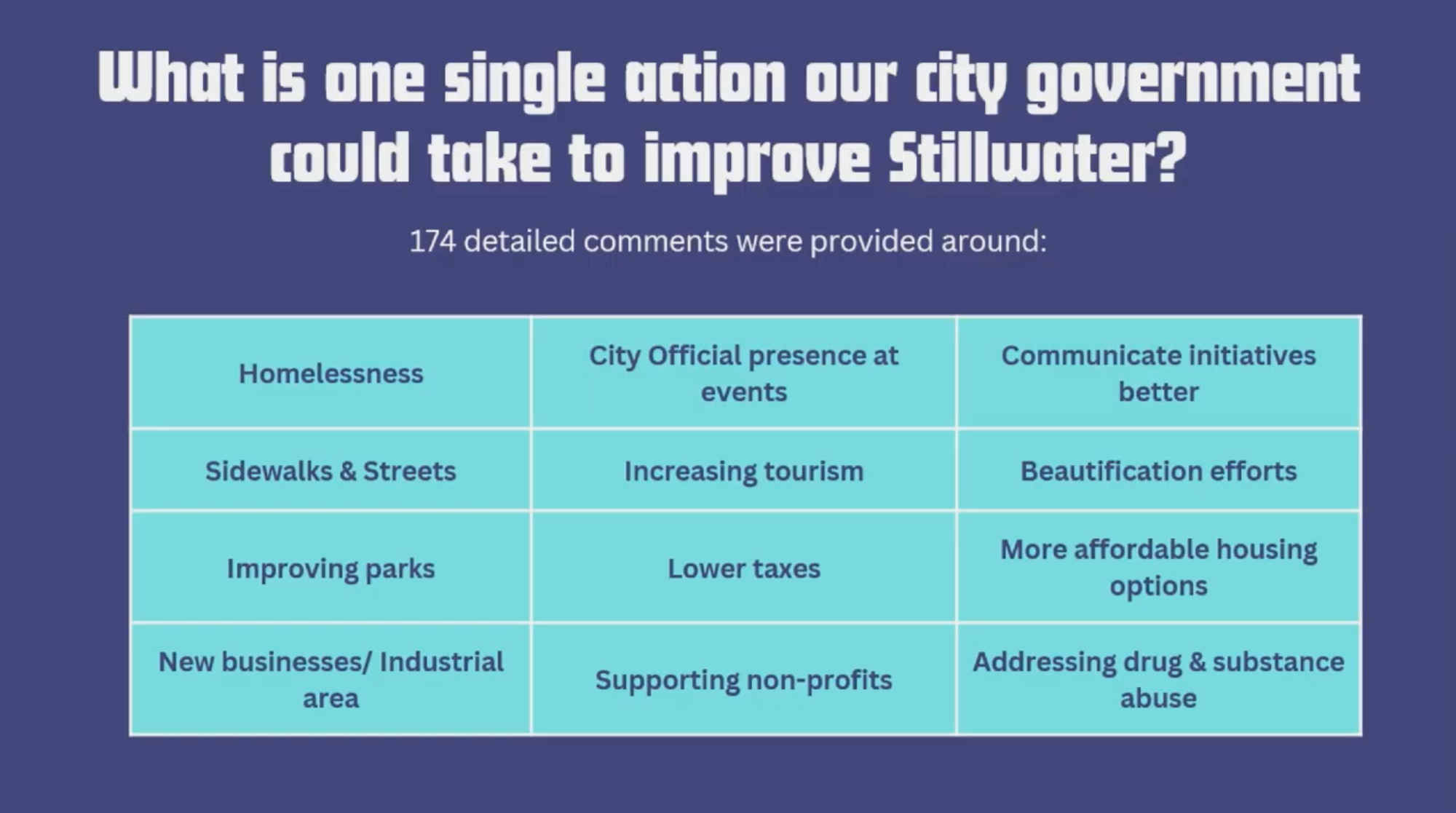 When asked what single action city government could take to improve Stillwater, responses included addressing homelessness, improving sidewalks and streets, creating affordable housing, supporting nonprofits and communicating initiatives better.
