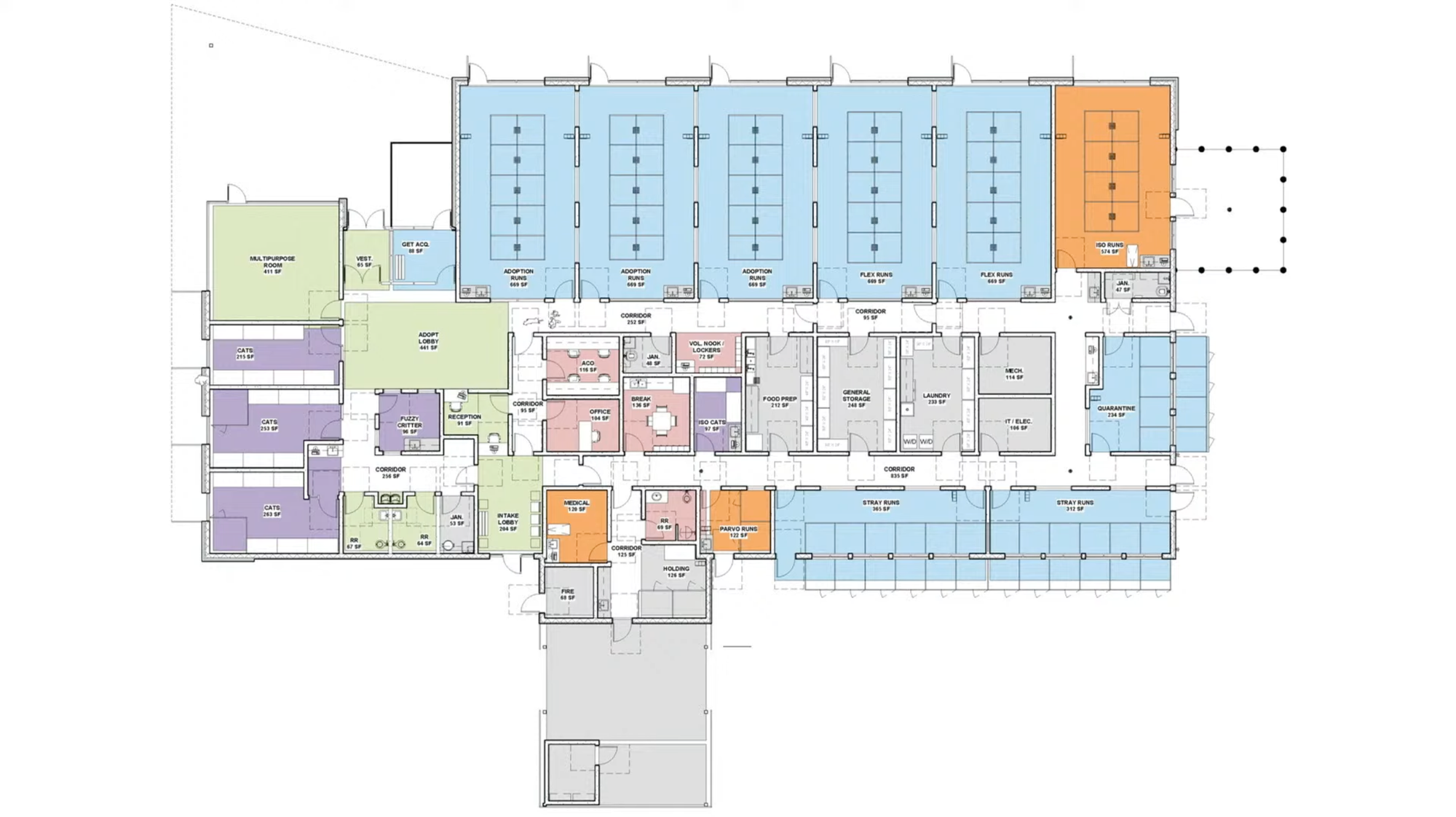 The angle of the proposed facility is intentional. According to City staff, this design will facilitate better heating and cooling of the kennels and catteries.