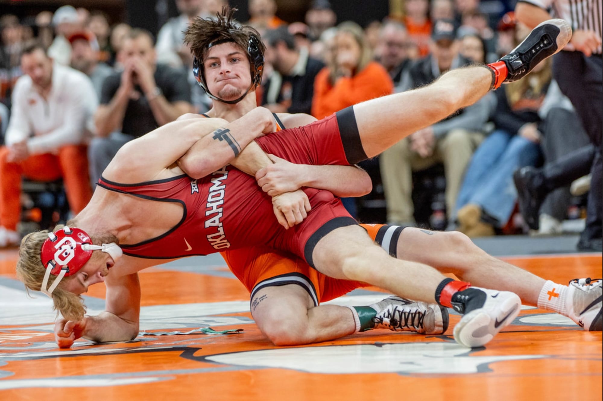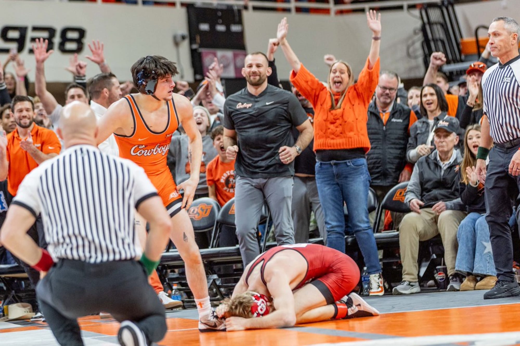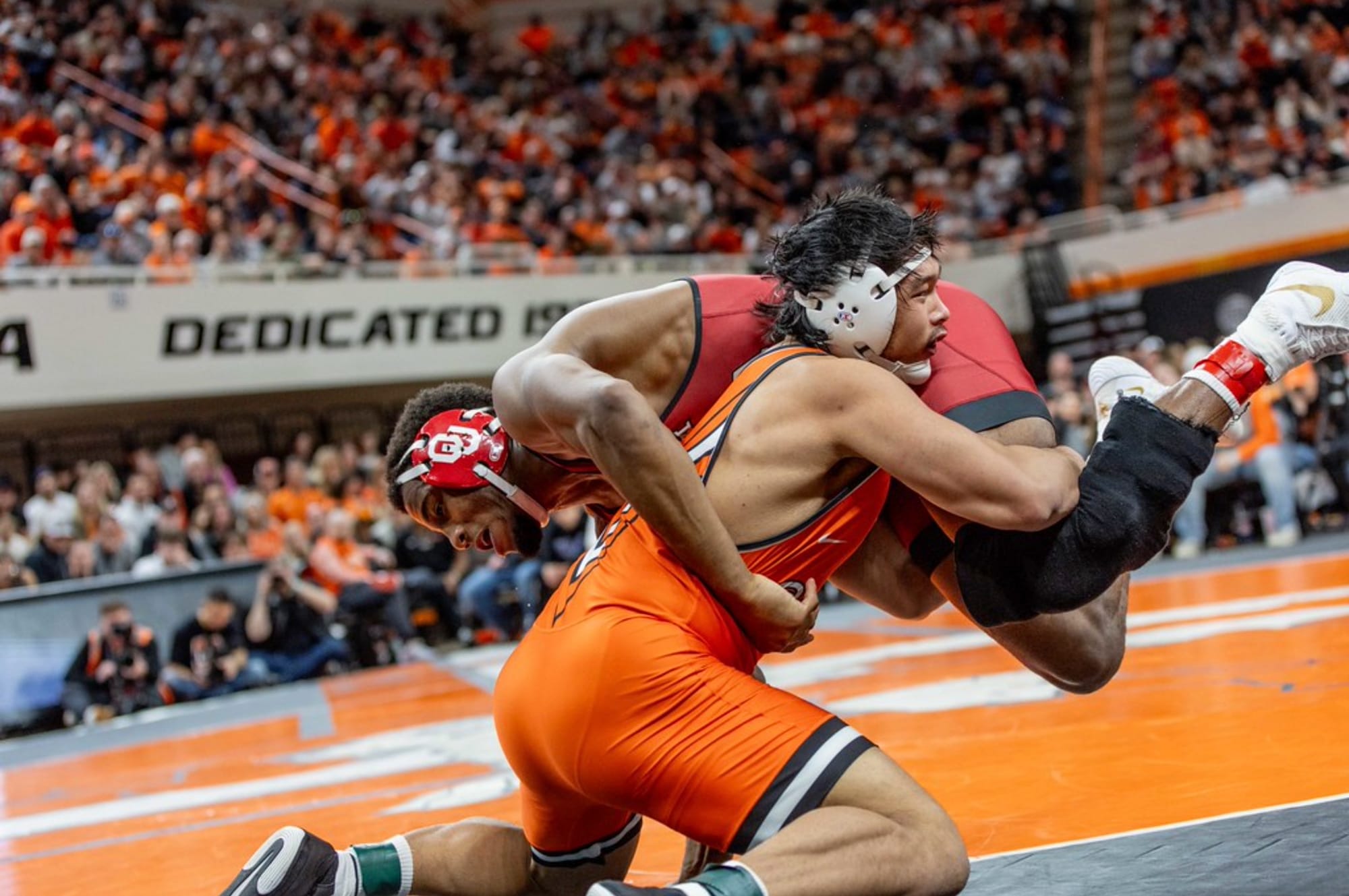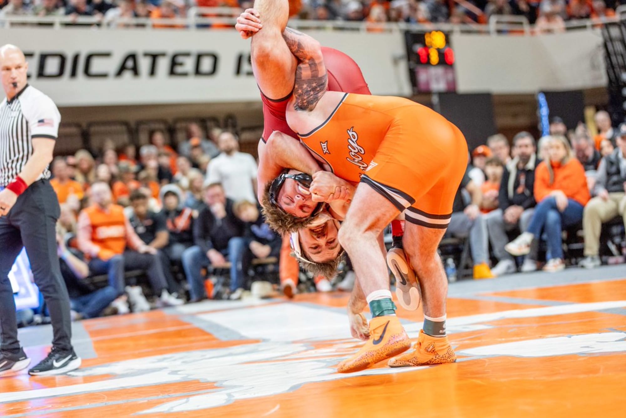 Lipps Inc’s “Funkytown” echoed through the Gallagher-Iba Arena sound system as the crowds grew louder by the second. The only thing that mattered to all 12,549 fans present for No. 5 Oklahoma State’s 37-0 win against No. 15 Oklahoma — the lone edition of Bedlam wrestling this season — was the name appearing on the videoboard.