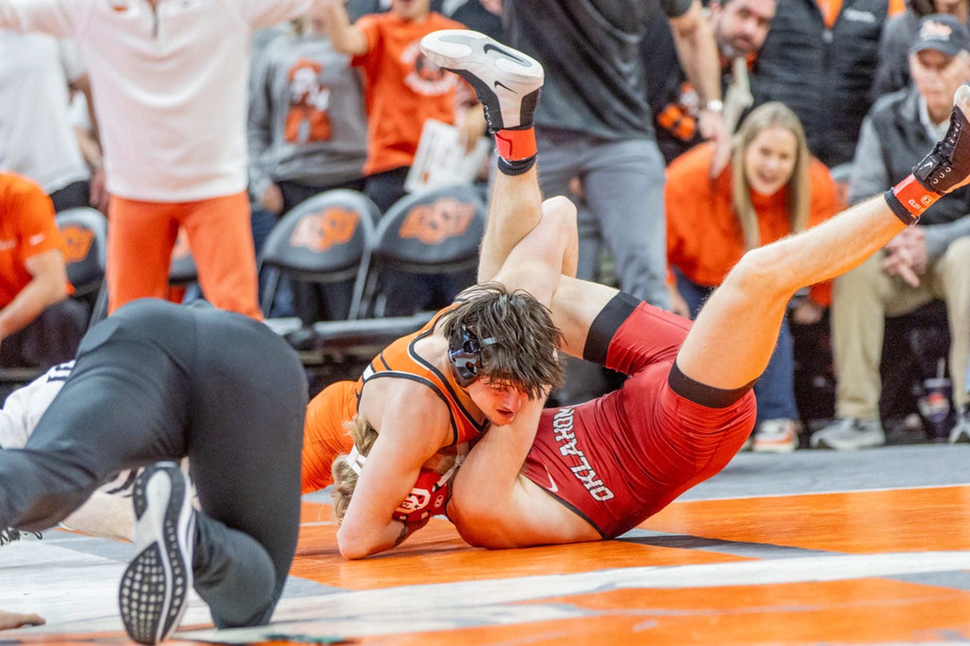 Oklahoma State freshman Jax Forrest pins Oklahoma's Carter Schmidt in 47 seconds during his collegiate debut at the Cowboys' 37-0 Bedlam victory Jan. 11, 2026, at Gallagher-Iba Arena. Forrest, the No. 1 pound-for-pound recruit in the 2026 class, recorded two takedowns before locking Schmidt in a cradle for the fall. – Photo by Bruce Waterfield/OSU Athletics