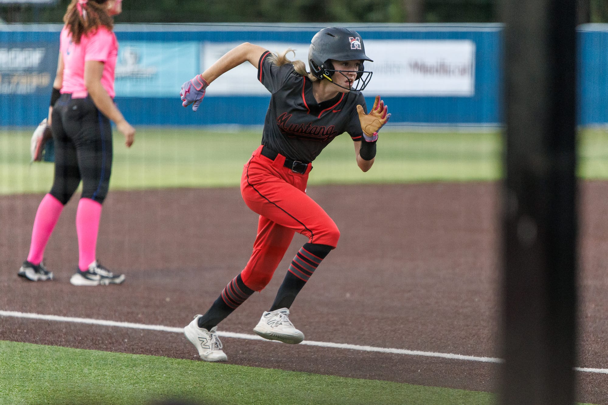Mustang's Abigail Keele (00) catches a overthrown ball at second and Adyson McGavock (4) heads home to score in their win over the Pioneers. – Photos by Chris Peters