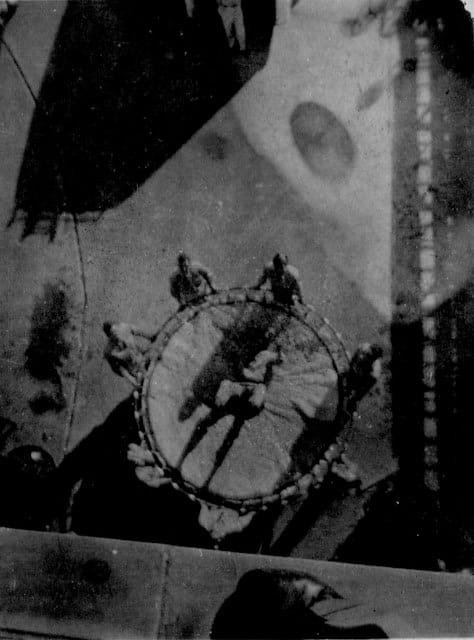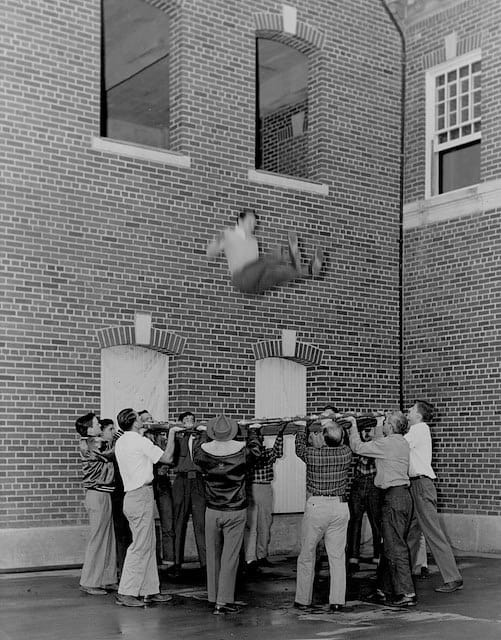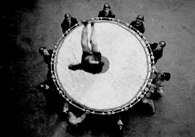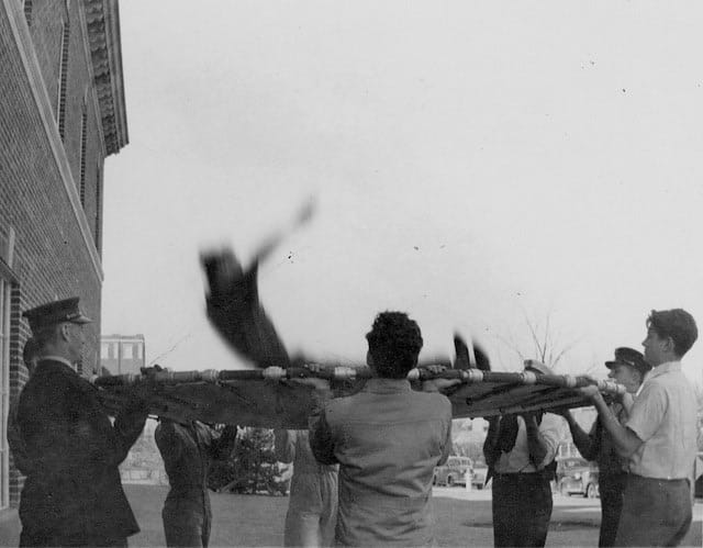 Historic photographs from the 1940s document a Stillwater Fire Department catch net demonstration on the Oklahoma A&M campus. The sequence shows spectators gathered at the building's base, a person mid-jump, and multiple perspectives of the landing into the safety net held by firefighters. These catch nets were an essential rescue tool before modern aerial ladder trucks became standard equipment. The images are among approximately 2,000 photographs and documents in the Fire Department Collection that Stillwater Public Library digitized through a $14,000 grant from the Oklahoma Historical Society, preserving decades of firefighting techniques and equipment for researchers and community members. – SPL Digital Archive