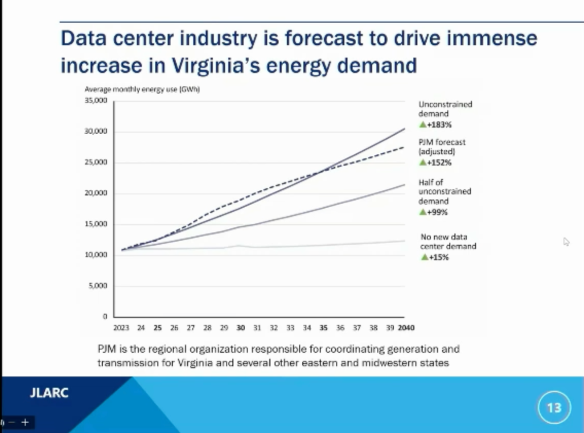 Virginia's independent energy forecast projects demand could triple by 2040 under an unconstrained scenario, or double even if only half of projected demand materializes, Gribben said. Meeting even the half-demand scenario would require nearly doubling existing generation capacity and significant increases to transmission and imports, he said.