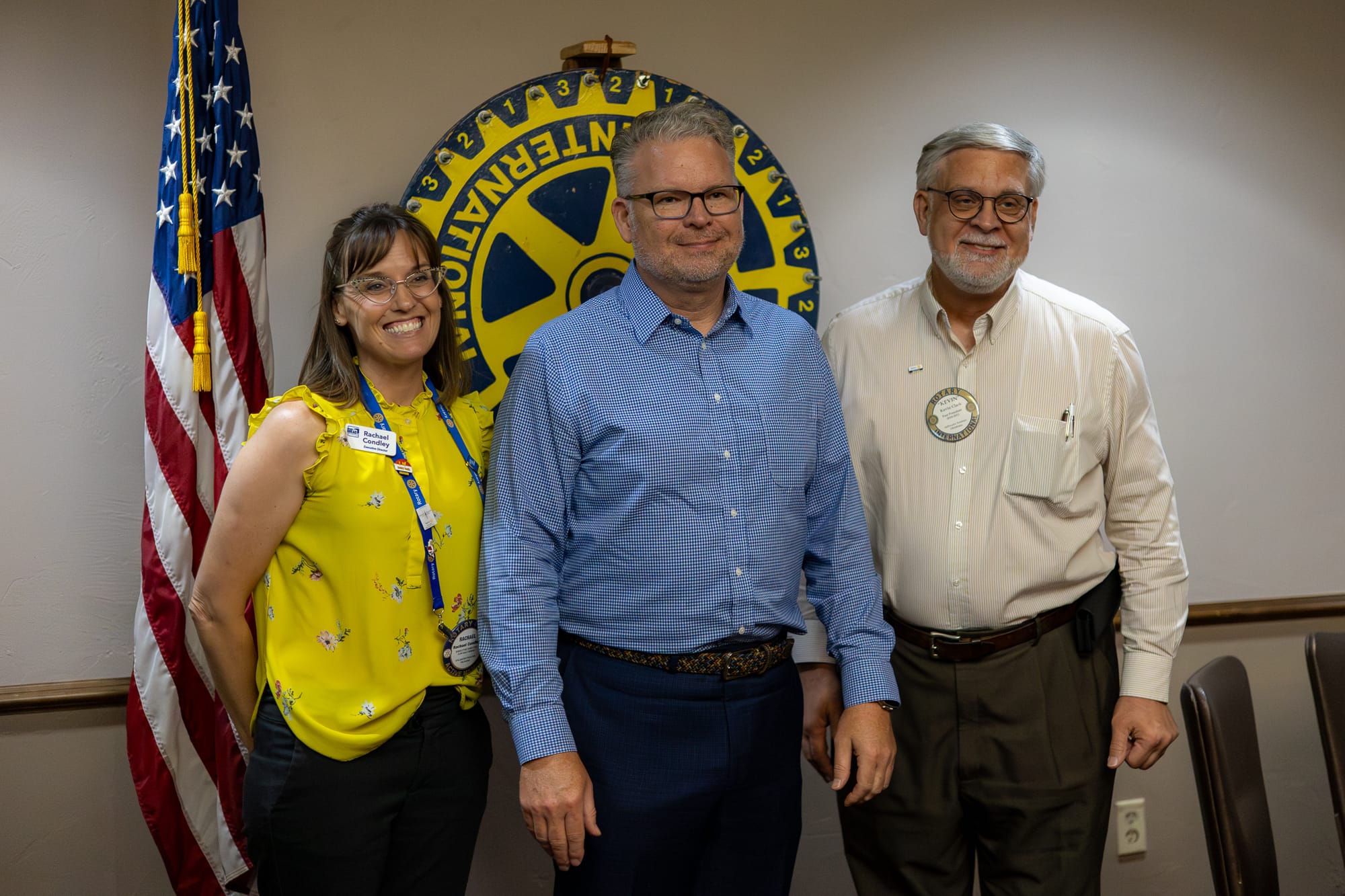 Mark Blakeman is joined by Stillwater Frontier Rotary President Rachael Condley, left, and Rotarian of the day Kevin Clark. – Photos by Chris Peters