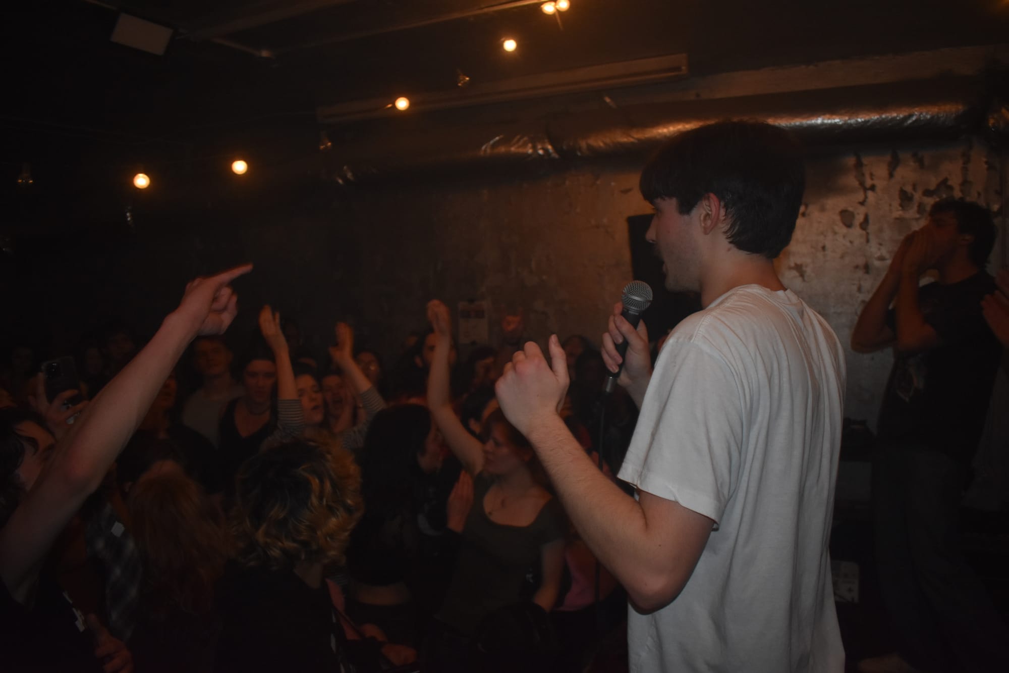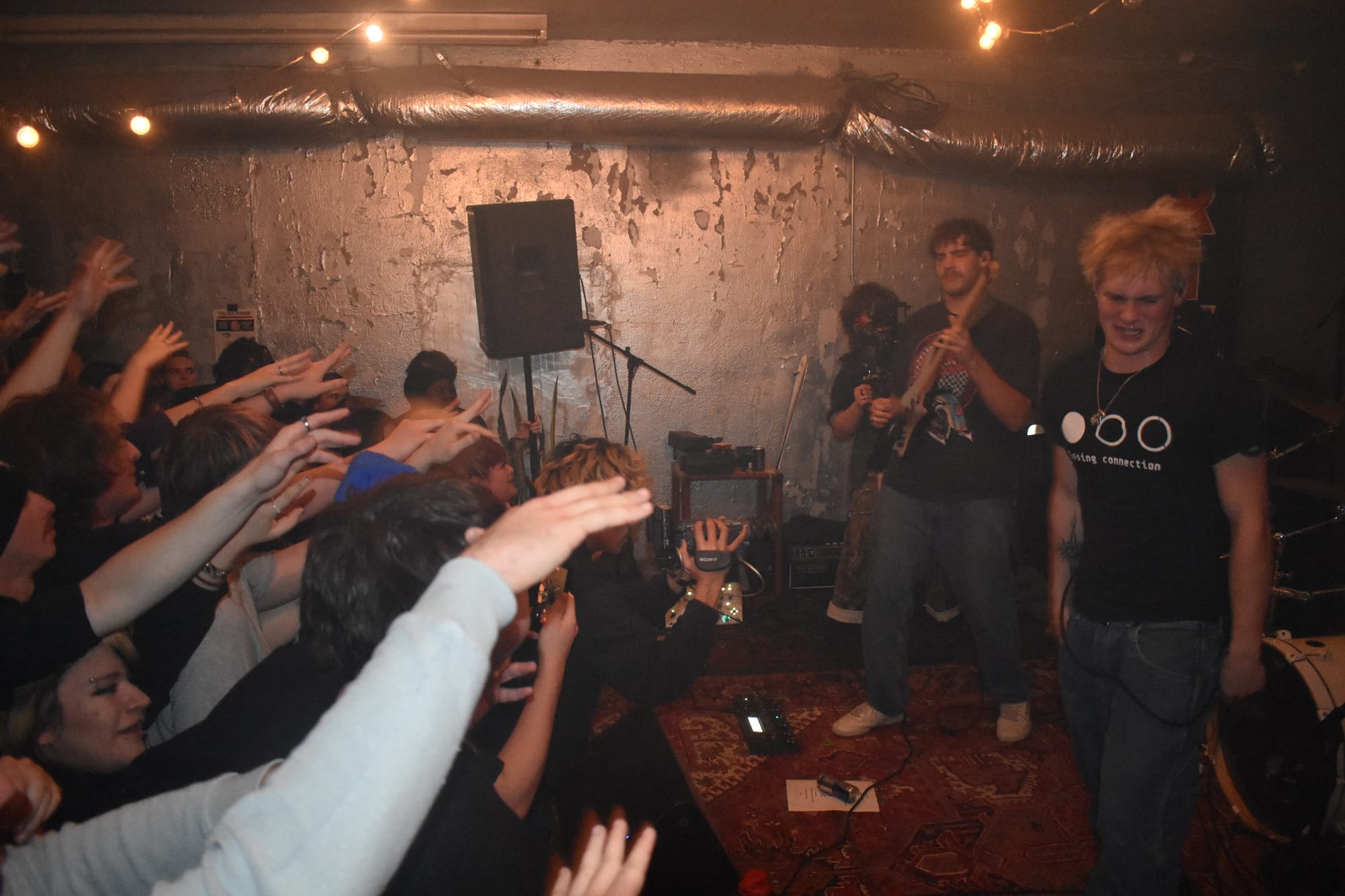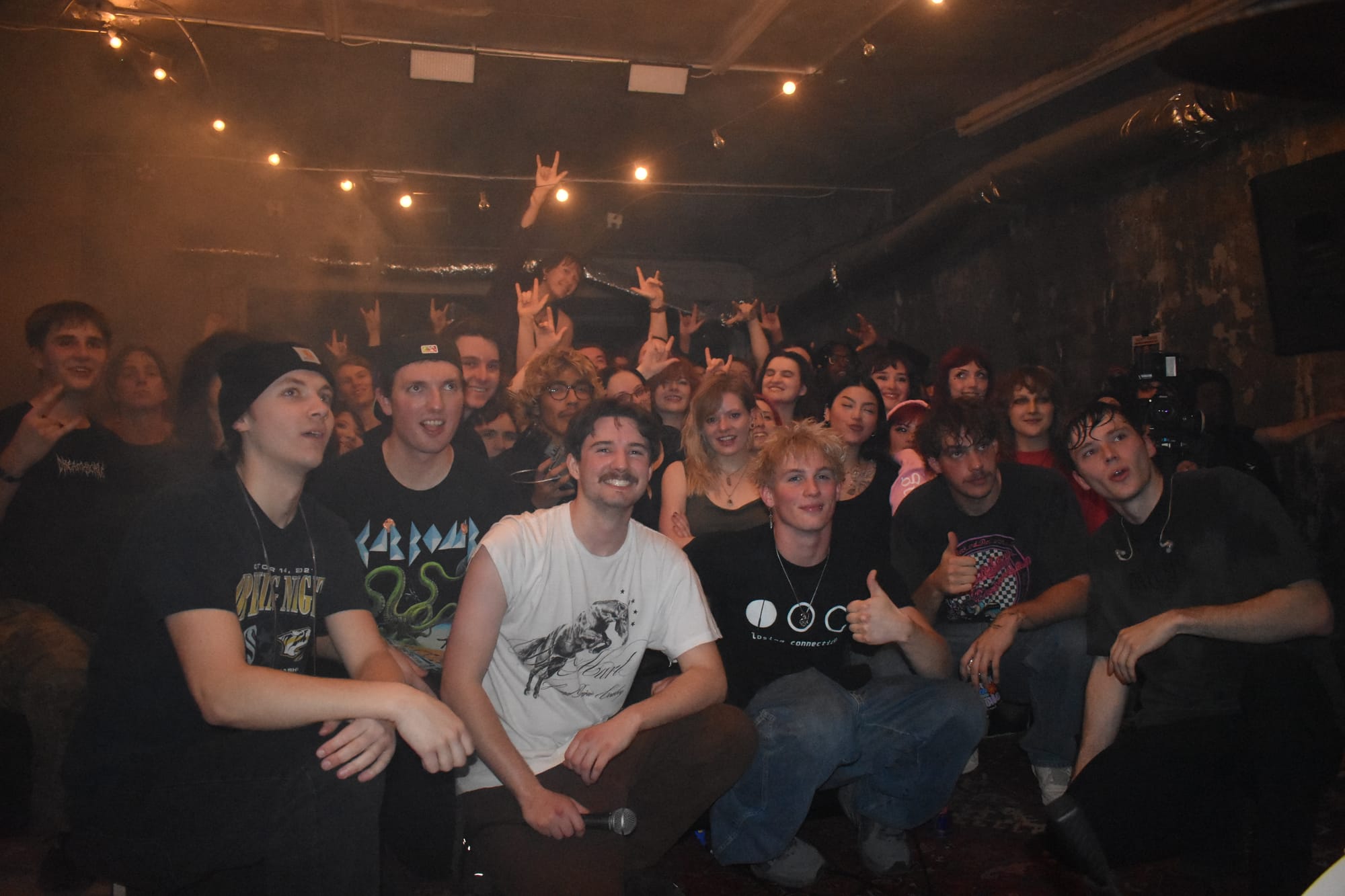 Dreamsickle closes out Velvet Fudge Records' opening night Saturday, Feb. 7. Top left: The band performs in the packed DIY venue. Top right: Lead vocalist Asa, roommate of owner Henry Ramsay. Bottom left: Ramsay speaks to the crowd. Bottom right: The band and fans gather for a group photo after the set. – Photos by Quincy Einstein