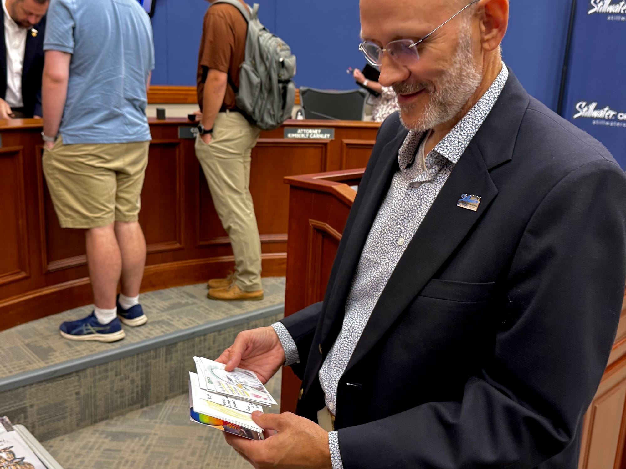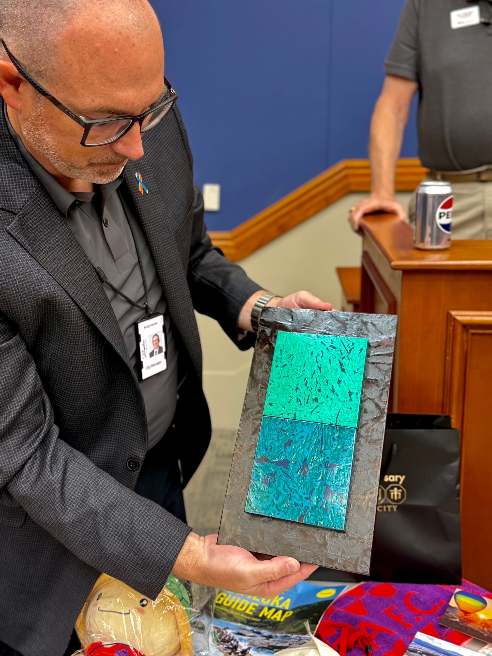 The Stillwater delegation returned with various items from their trip to Kameoka Japan including an art piece by Kurimoto Natsuki titled "Friendship" at the Oct. 6, 2025 City Council Meeting. The art will be displayed in the Stillwater Community Center. – Photos by Chris Peters
