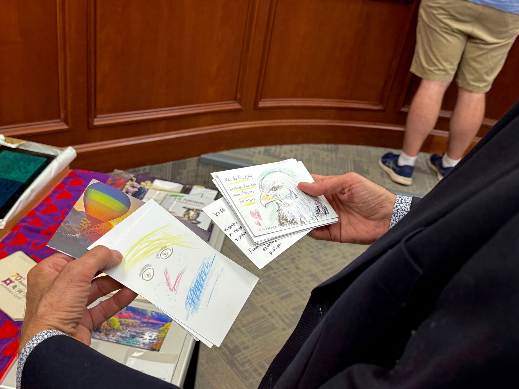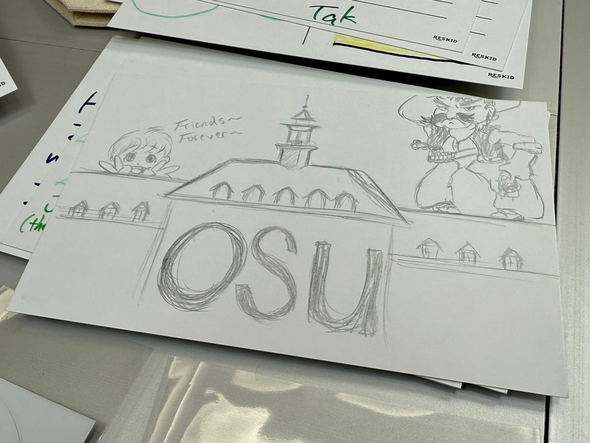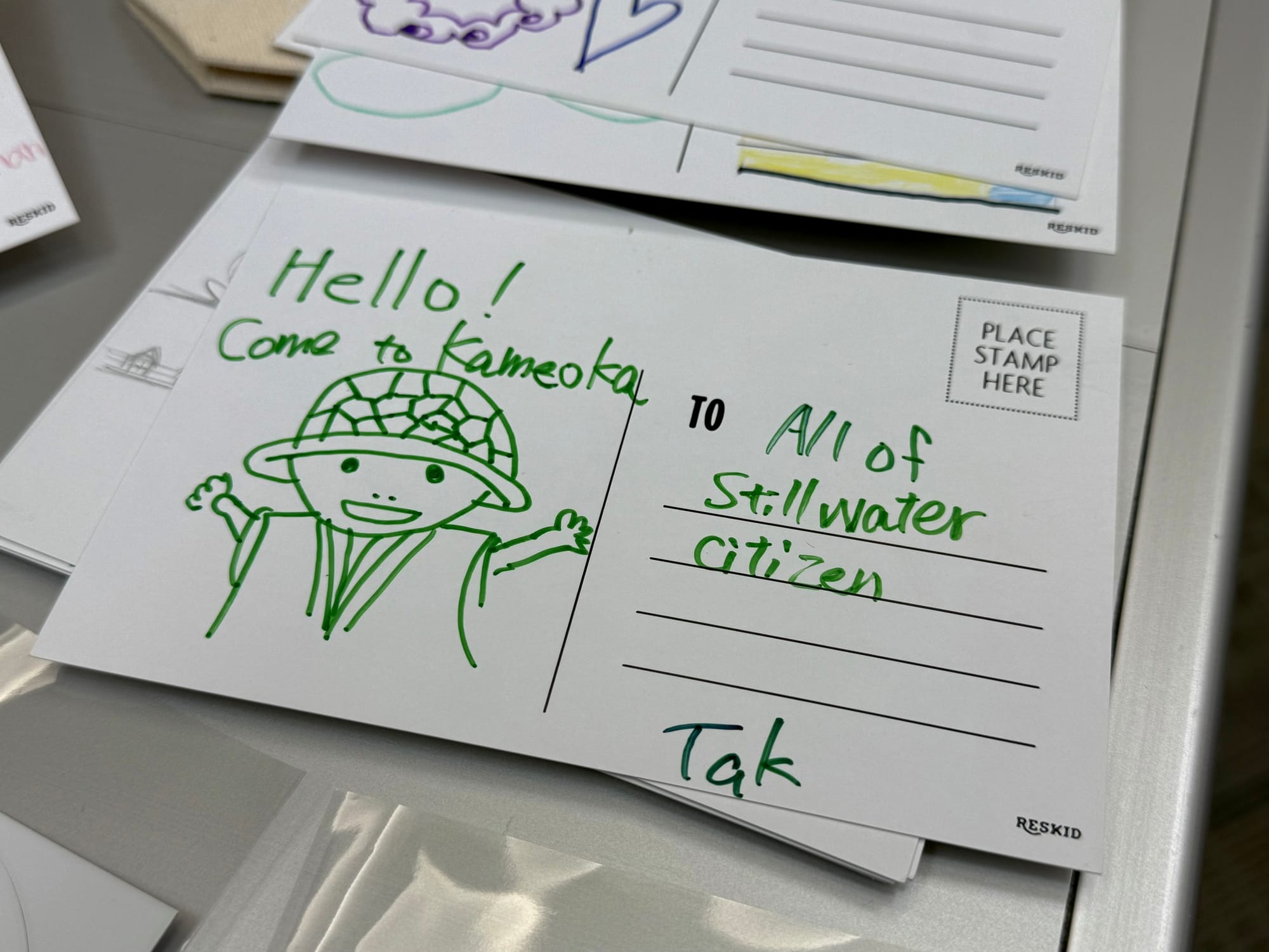 City Director of Engineering Bill Millis looks through postcards from Kameoka students with handwritten drawings and messages. One card asks all Stillwater citizens to visit and another depicts Edmon Low Library, Pistol Pete and an anime character with the phrase "Friends Forever" written in english. – Photos by Chris Peters