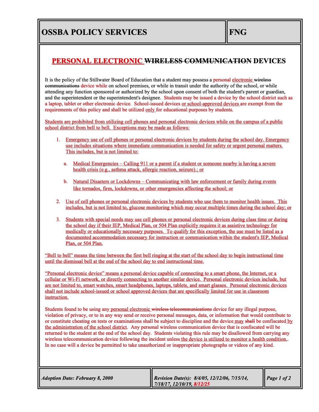 The Stillwater Board of Education approved a new policy prohibiting student use of personal cell phones and electronic devices during school hours at its Aug. 12 meeting, complying with state law while also reporting significant improvements to the district's financial position.