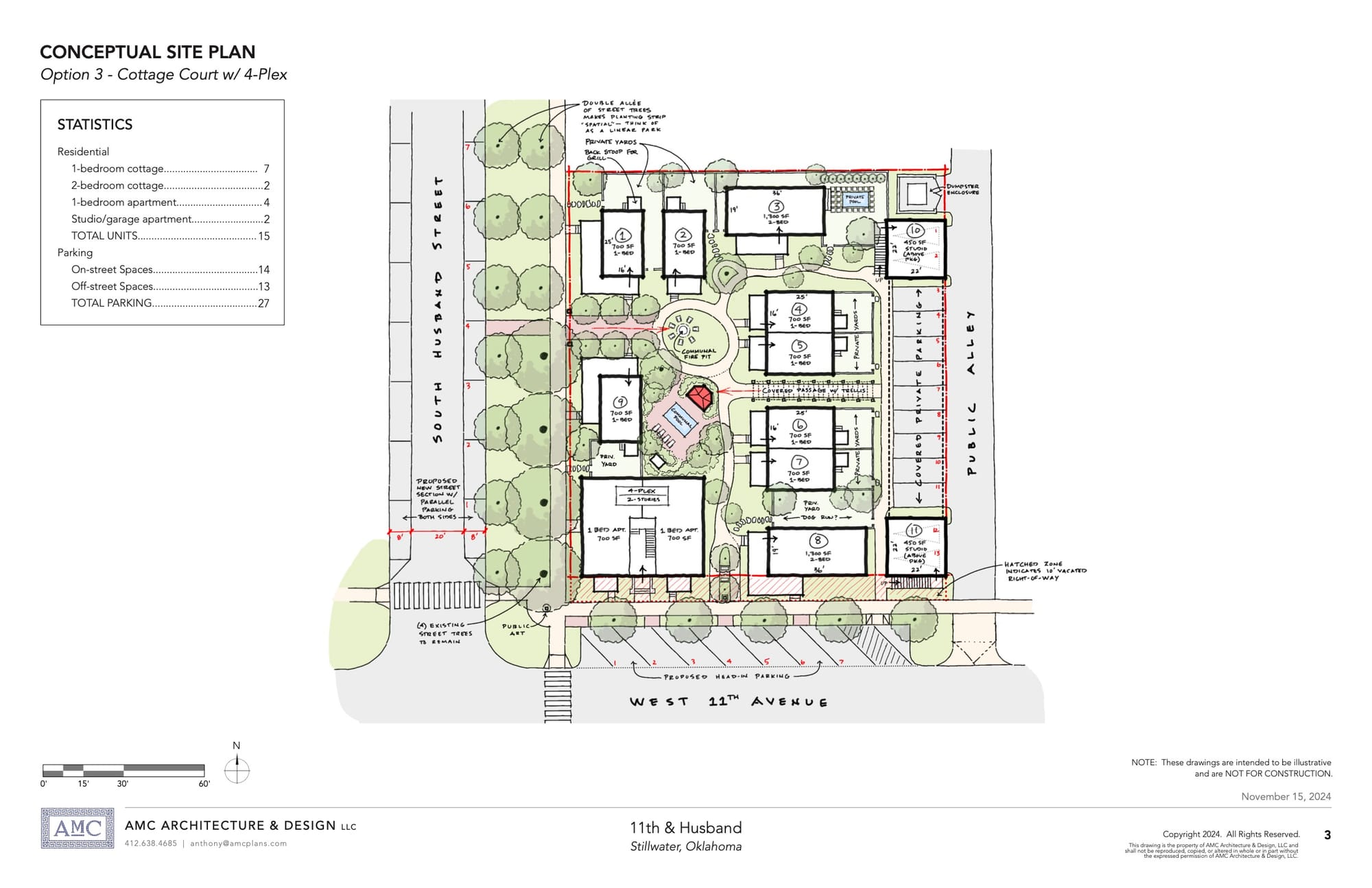 The development plans include improving the alley for access, adding diagonal parking along 11th Avenue, and creating inset parallel parking on Husband Street to maintain traffic flow.