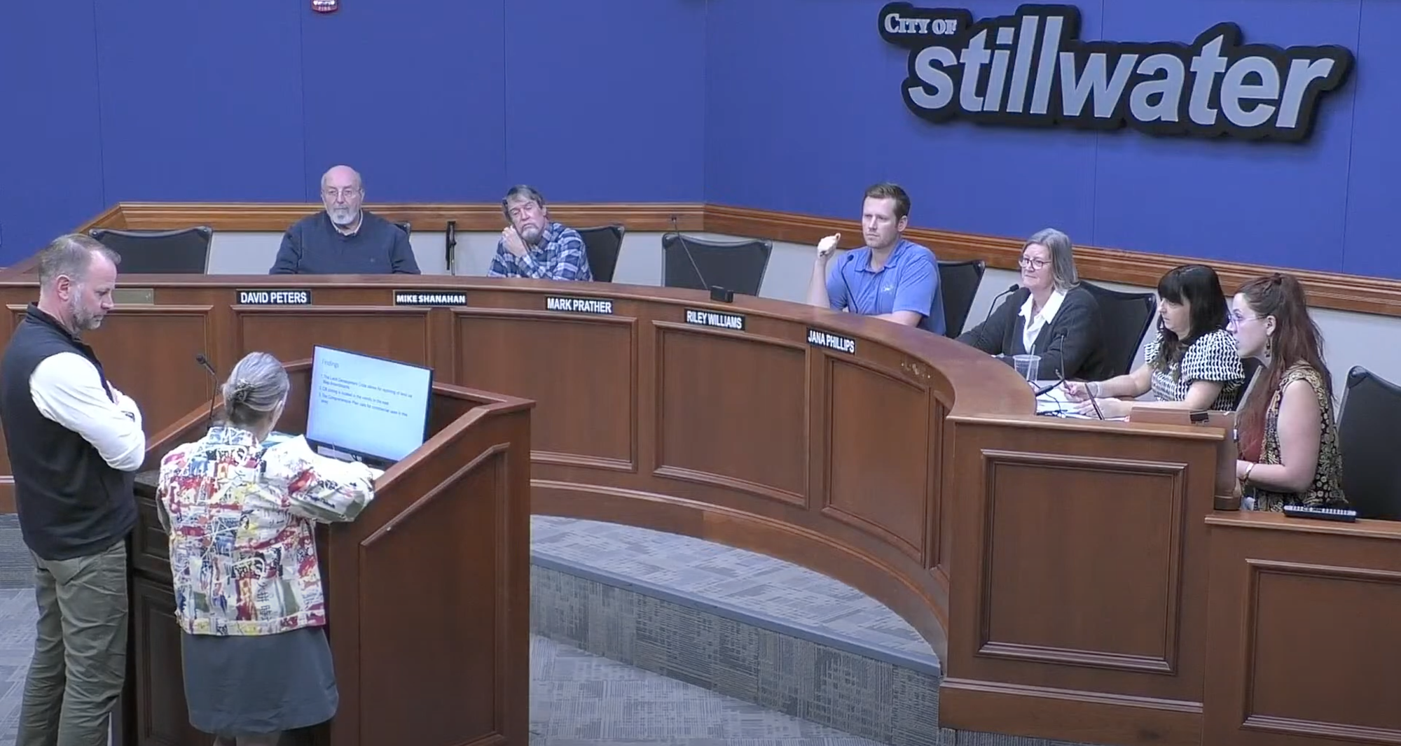 Cory Williams, left, and Stephen Gose, right, answer questions about the project from a nearby property owner Sharon Hoecker, center, at the April 15, 2025 Planning Commission meeting. – City of Stillwater YouTube