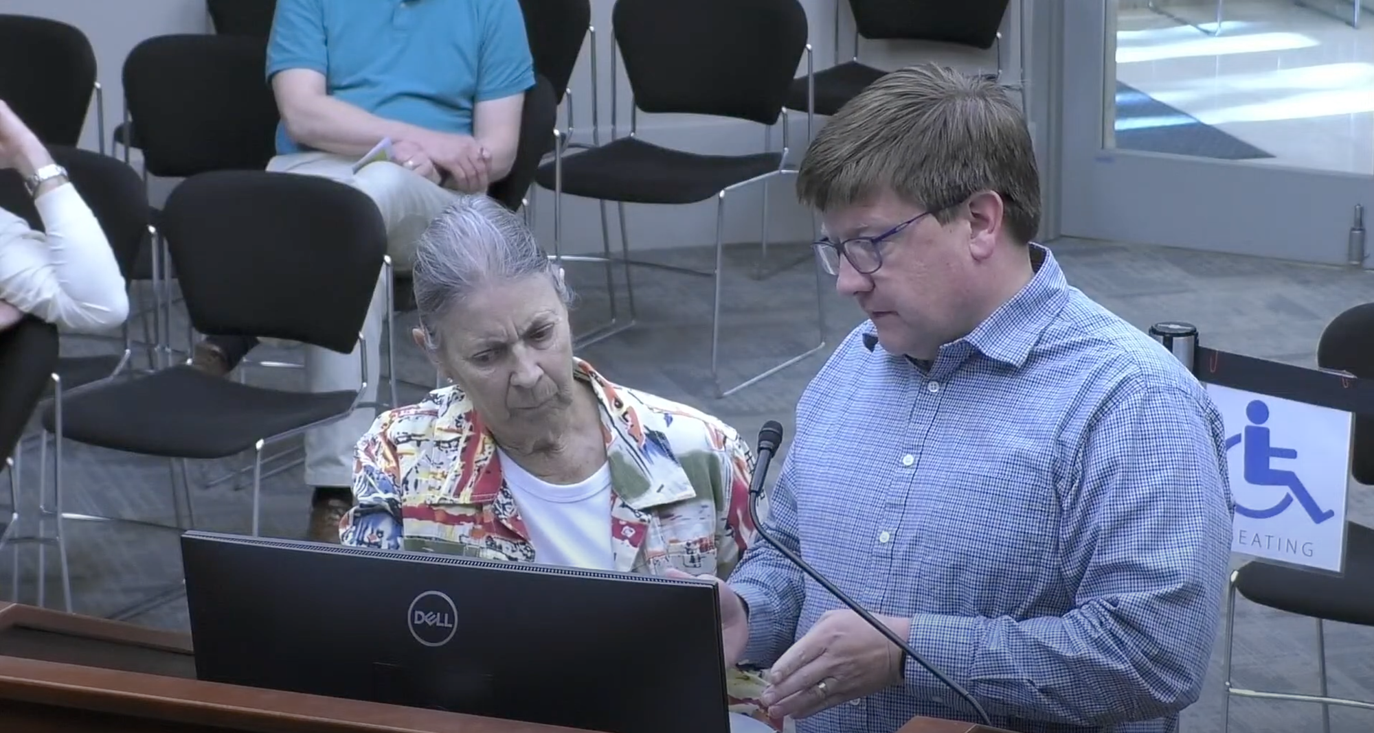 During the public hearing, a nearby property owner, Sharon Hoecker, asks questions about the project's density, lot configuration, and potential impact on Husband Street. Gose assures that the development will include sidewalks along both street frontages and will not encroach on the right-of-way.
