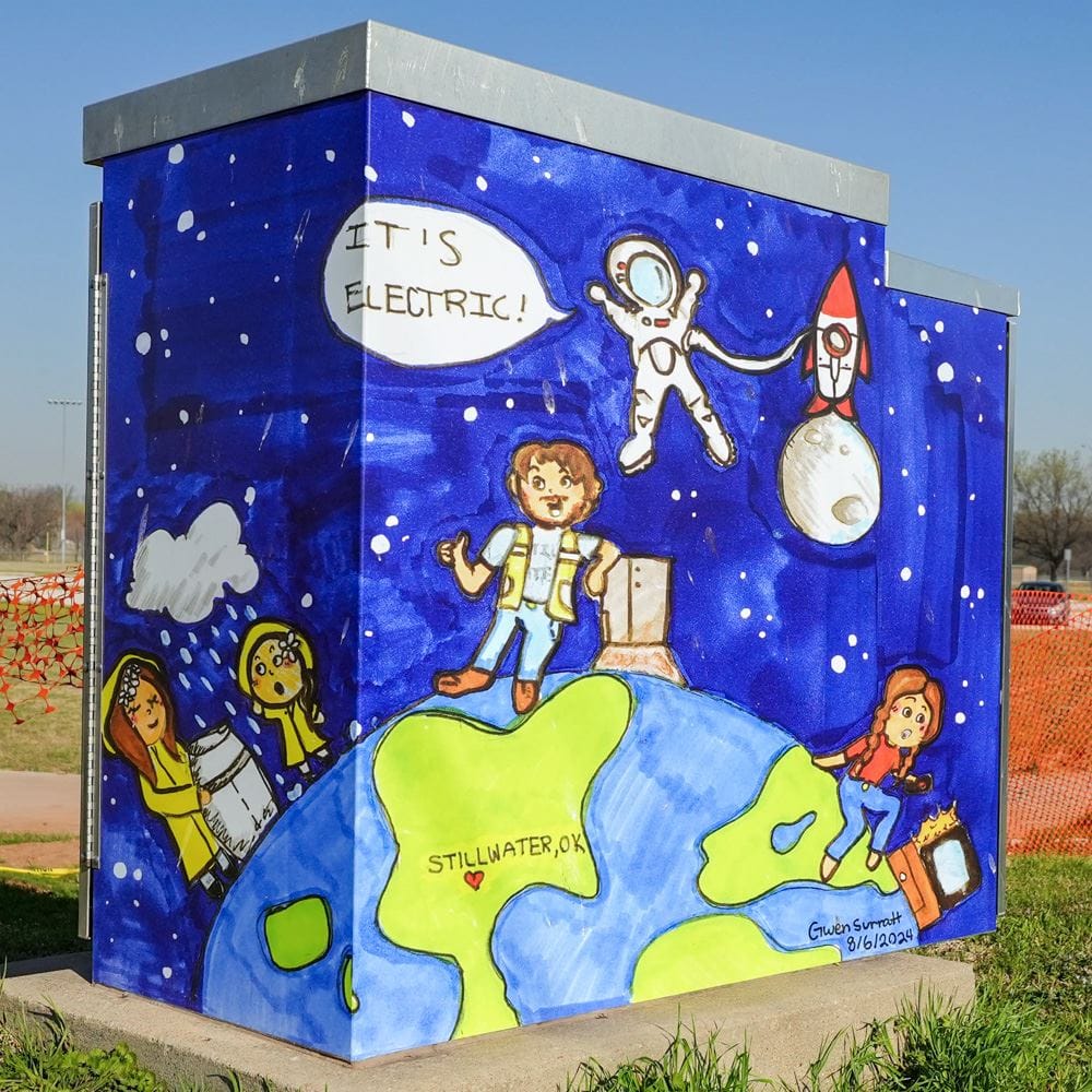 The winners of Stillwater’s inaugural utility box art program were inspired by the theme, “It’s Electric.” The program, started in 2024, invited students from Stillwater Public Schools, Meridian Technology, Oklahoma State University, and Northern Oklahoma College to submit artwork. – Provided