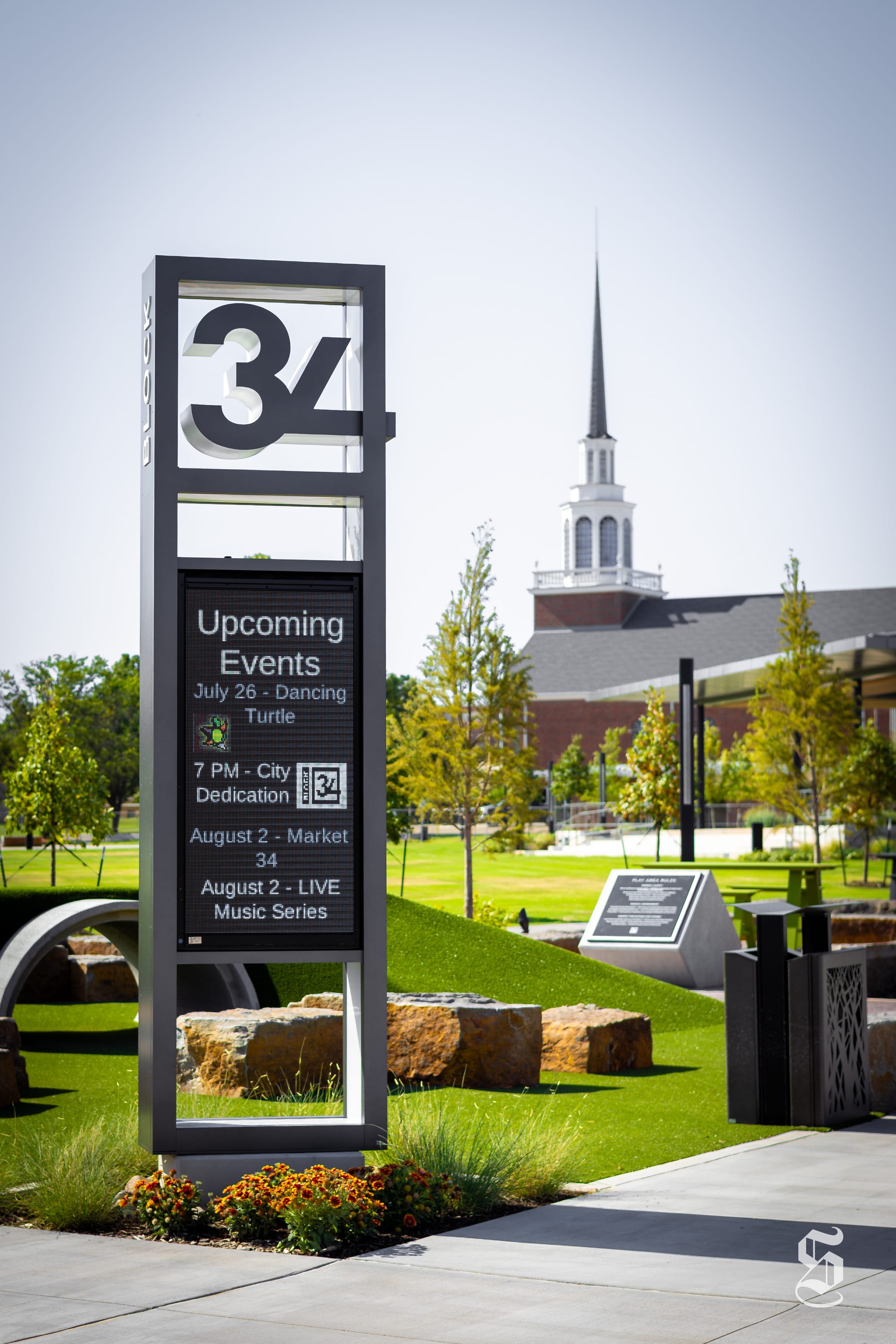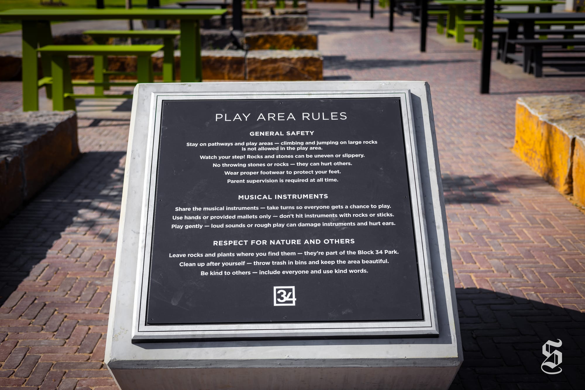 Block 34 includes amenities such as an inclusive natural playground, music play area, picnic tables and a space designed for food trucks. The park also includes a playful water feature to help cool off during warmer months.