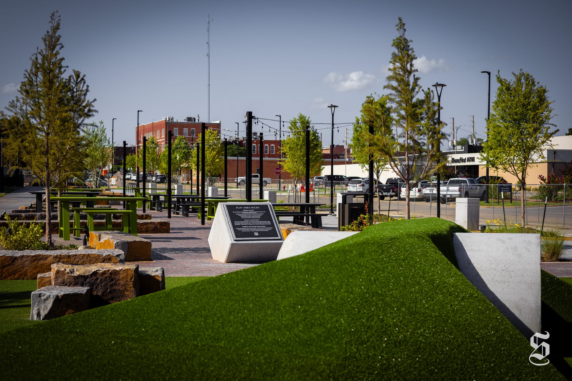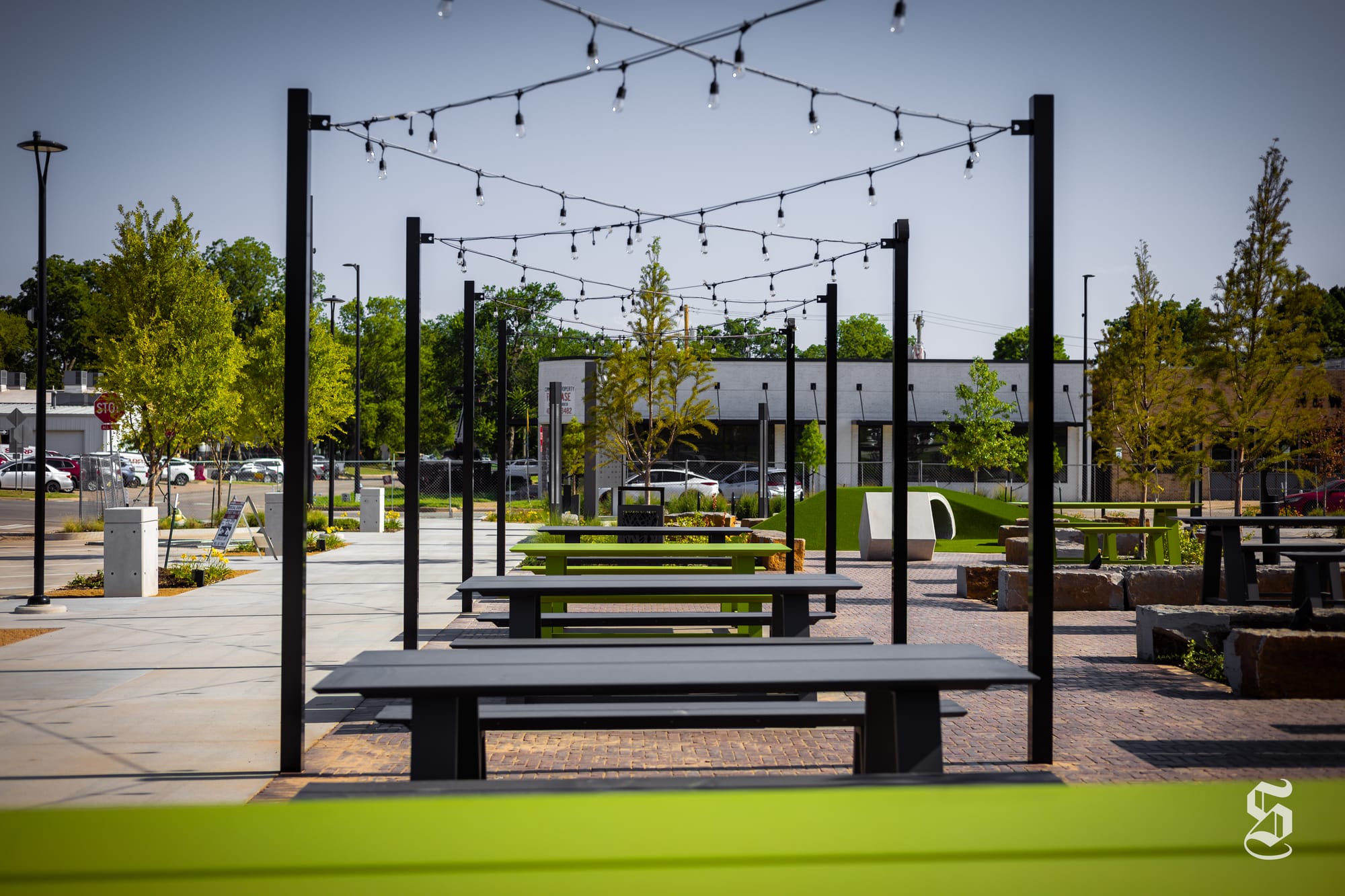 The "beer garden" is on the east side of the block with a children's play area on the southeast corner. The Simmons Bank Pavilion sits on the northeast corner of the block. – Photos by Chris Peters