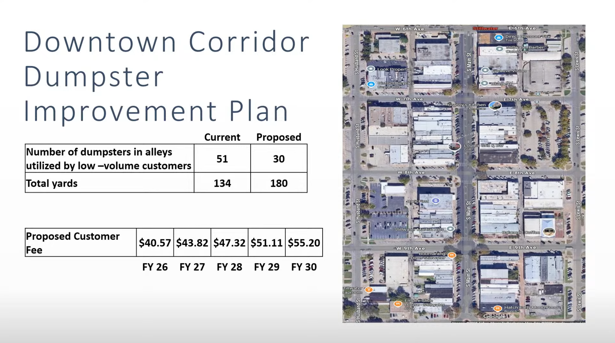 Stillwater's Waste Management Department presented a comprehensive plan to overhaul trash collection in the downtown corridor, proposing to reduce the number of dumpsters while significantly increasing collection frequency for most businesses.