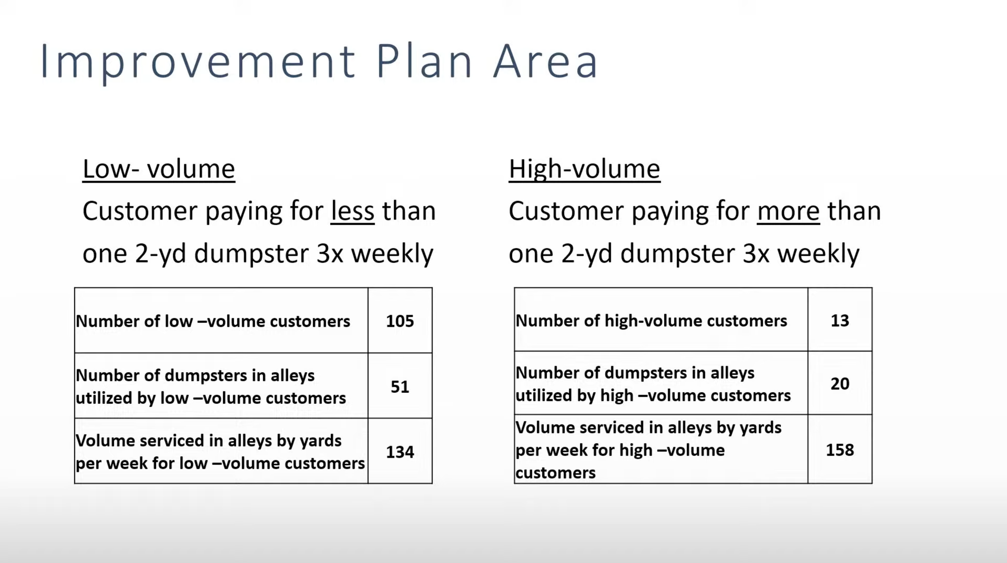 The plan classifies downtown businesses into two categories. Low-volume customers, numbering 105, would transition to the shared dumpster system. High-volume customers, primarily restaurants and hospitality businesses, would retain their individual dumpsters and current service schedules.