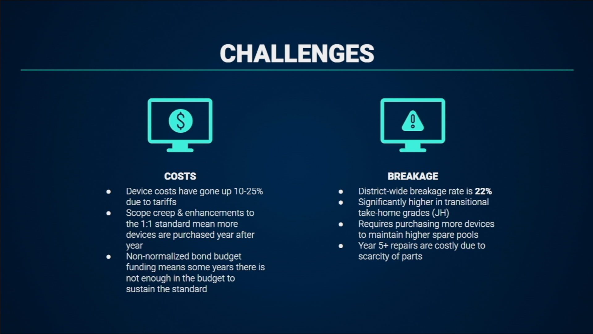 Bloomer reported that the district-wide breakage rate for devices stands at 22%, which he noted is below the 25-35% average seen in many districts. Junior high students have the highest breakage rates, presenting a challenge the district continues to address.