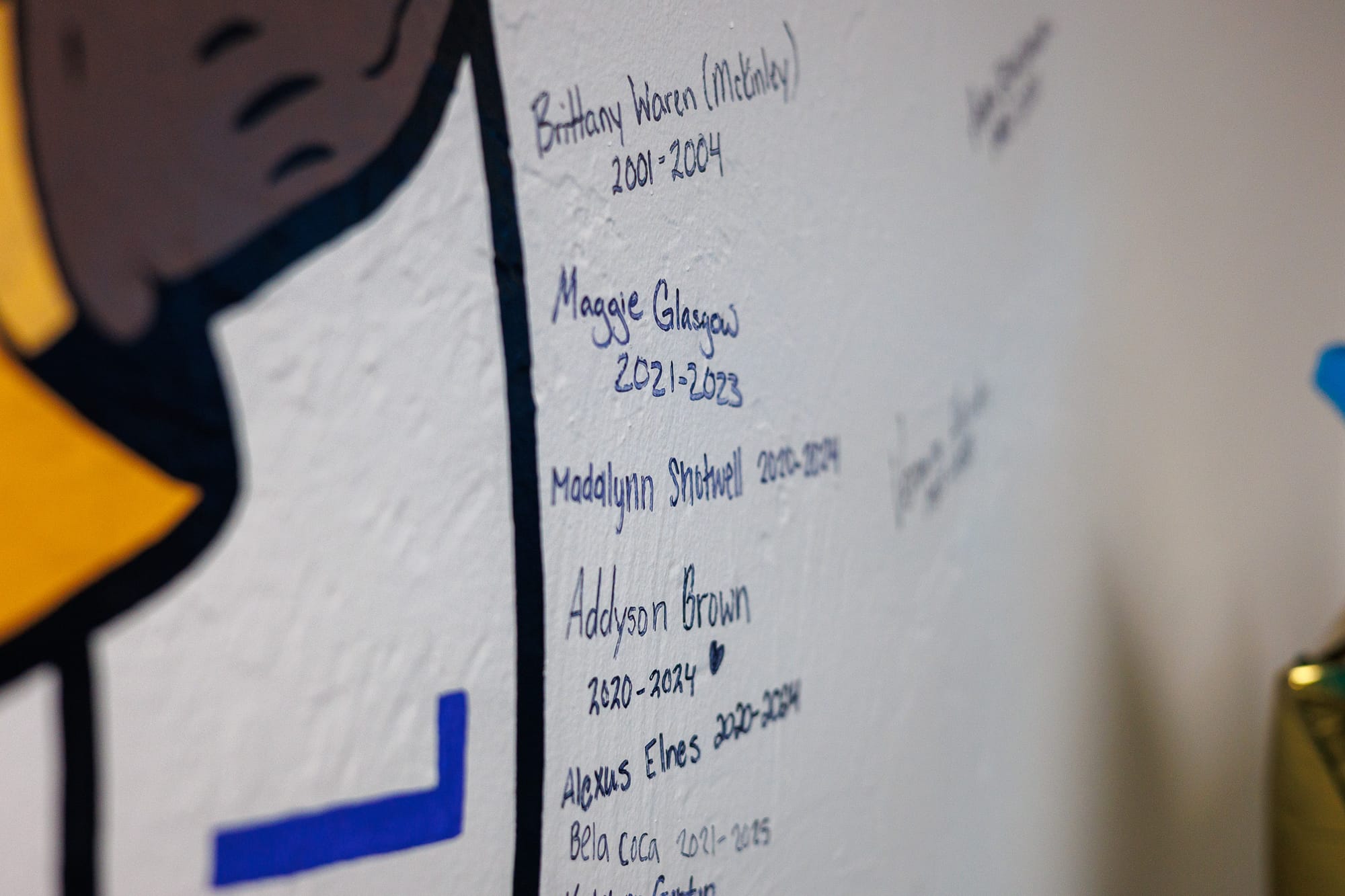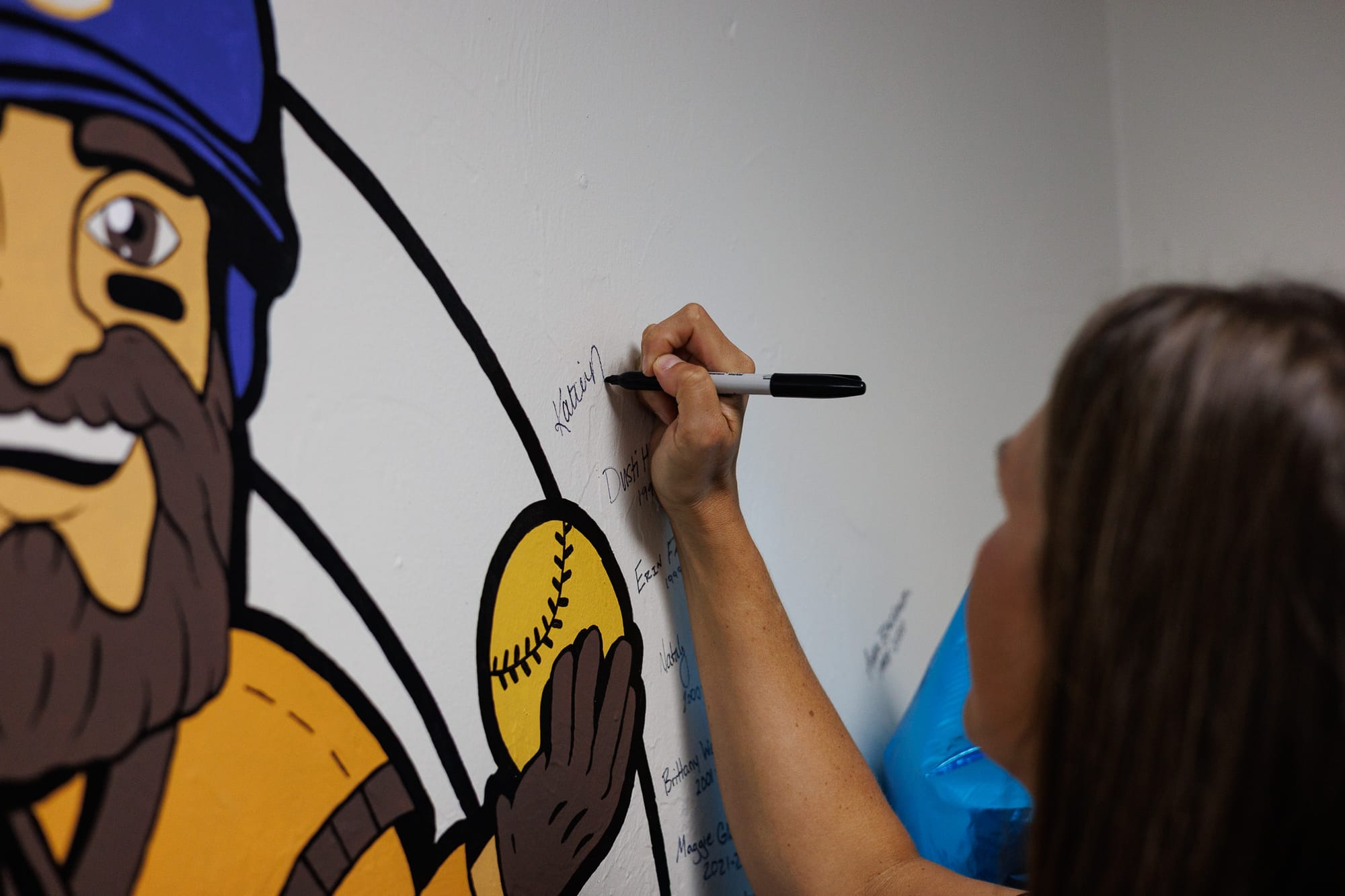 A wall in the newly renovated locker room is adorned with signatures from past players. Katie Norris who played for the Pioneers from 2004-2008 adds her signature to the wall. – Photos by Chris Peters