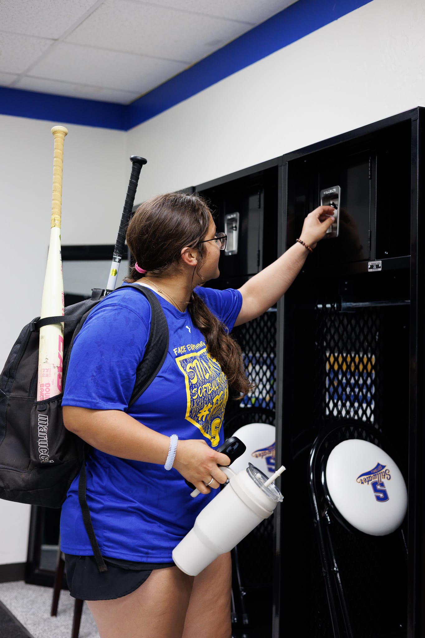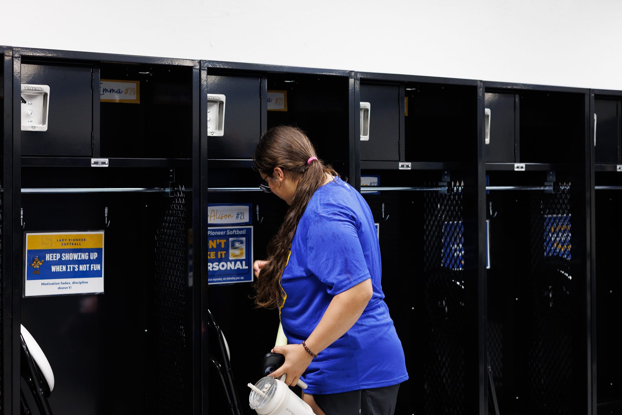 Alison Aguilar collects her softball gear from the newly installed lockers. – Photos by Chris Peters