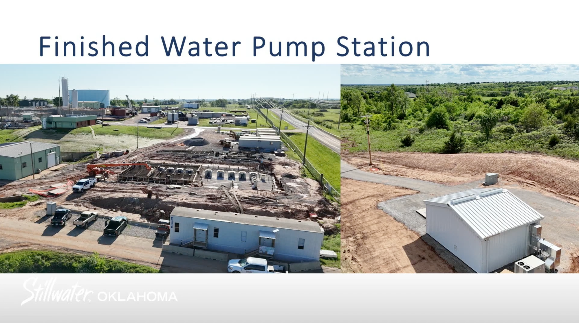 Chris Humes, Senior Project Manager, explained that the finished water pump station project, which began about a year ago, is approximately 50% complete and on budget at $30 million. The station is designed to distribute treated water to three pressure zones in the city.