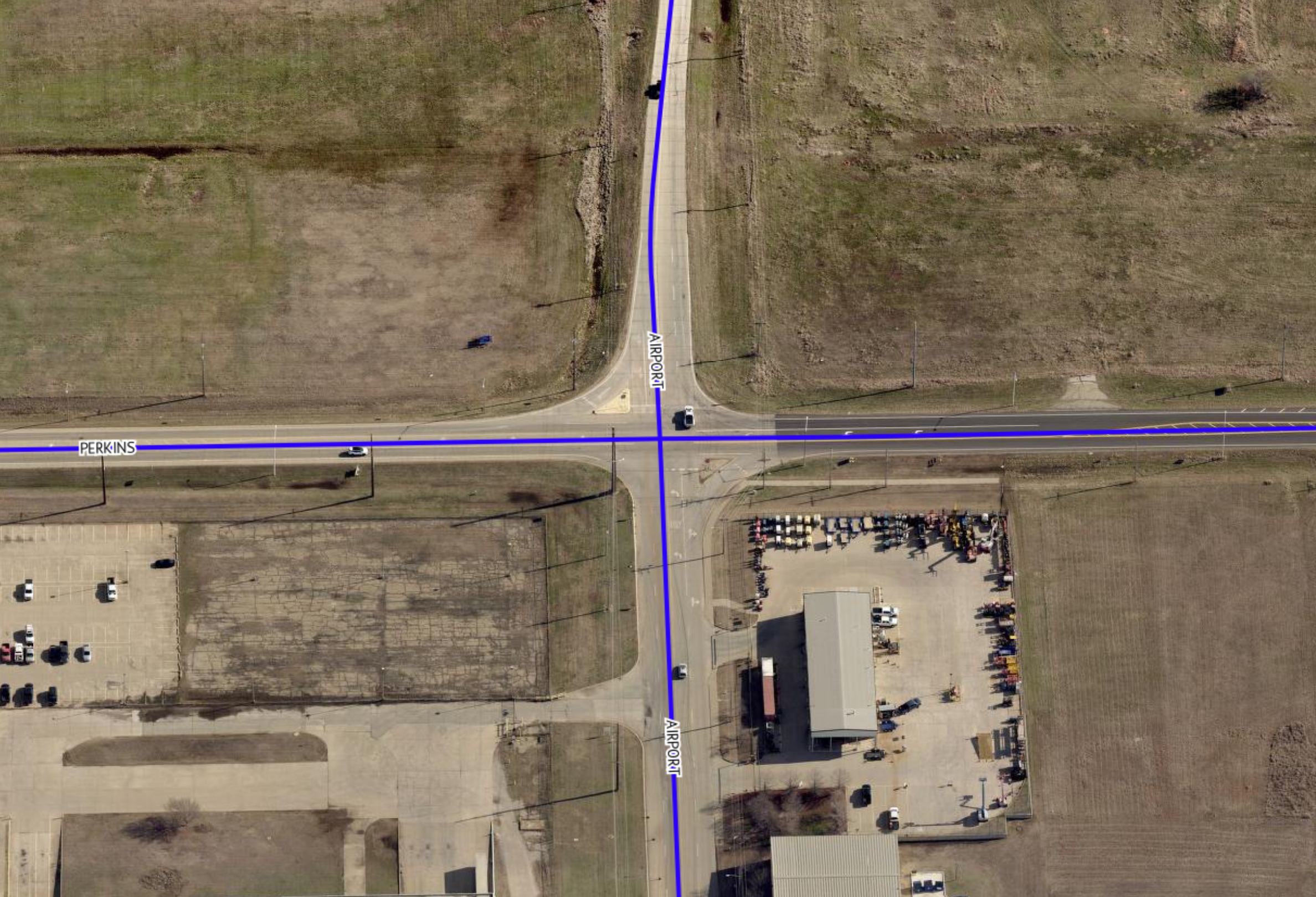 City officials continue negotiations with developers over improvements to the Perkins Road and Airport Road intersection, which will require signalization rather than a roundabout due to cost concerns.