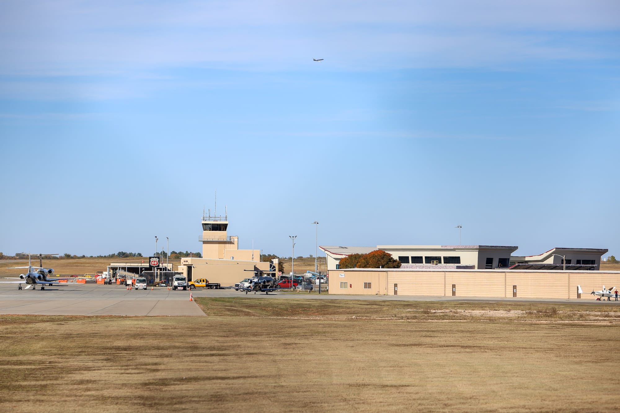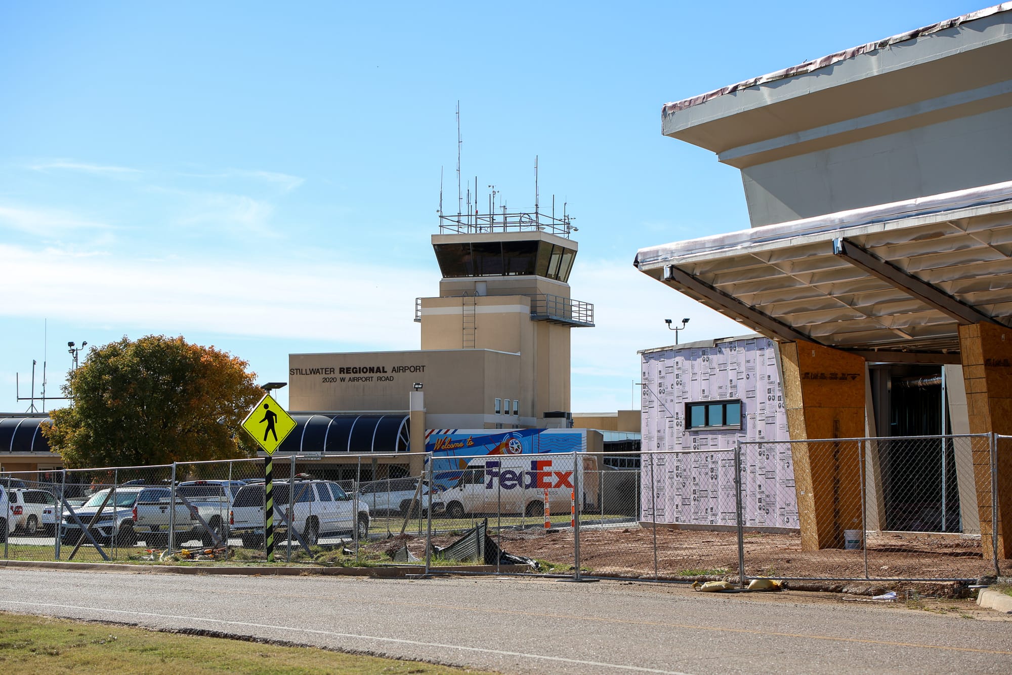 Stillwater Regional Airport operations continue normally Thursday as construction progresses on a new terminal building. The existing terminal (top left) and air traffic control tower remain fully staffed despite nationwide flight disruptions at major hubs. Construction of the new terminal (top right) is underway with a substantial completion date of July 26, 2026. Airport Director Kellie Reed emphasized that local operations are unaffected by Federal Aviation Administration directives reducing flights at 40 major airports. – Photo by Chris Peters