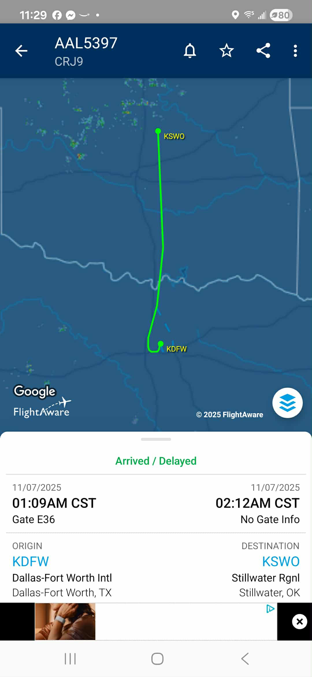 Flight 5397, an American Eagle service from Dallas-Fort Worth to Stillwater, landed more than two hours behind schedule at 1:05 a.m. Friday, according to FlightAware, marking the latest disruption for travelers connecting through one of the nation's busiest hubs.