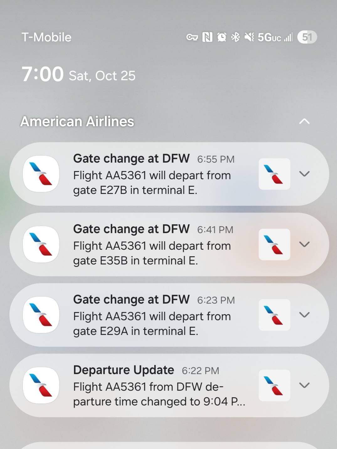 After rebooking through Oklahoma City, Collier faced a cascade of gate changes and delays at Dallas-Fort Worth, where severe weather and operational issues created hours-long waits.