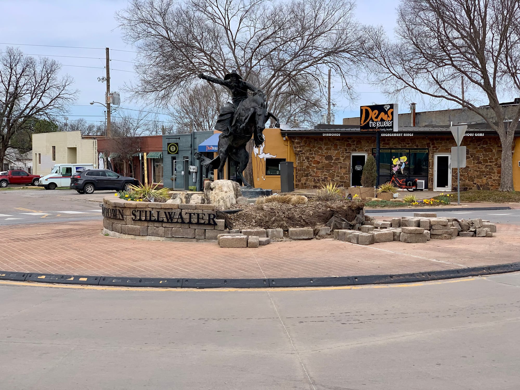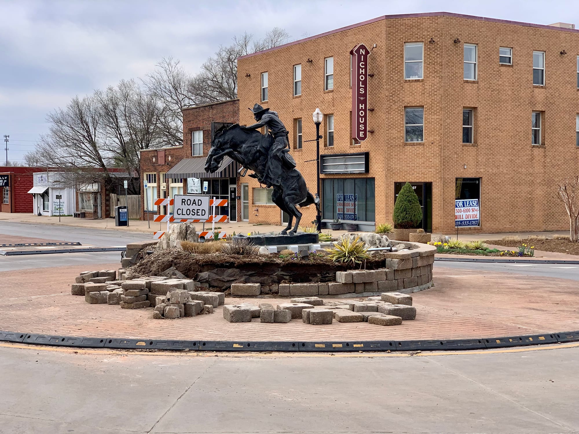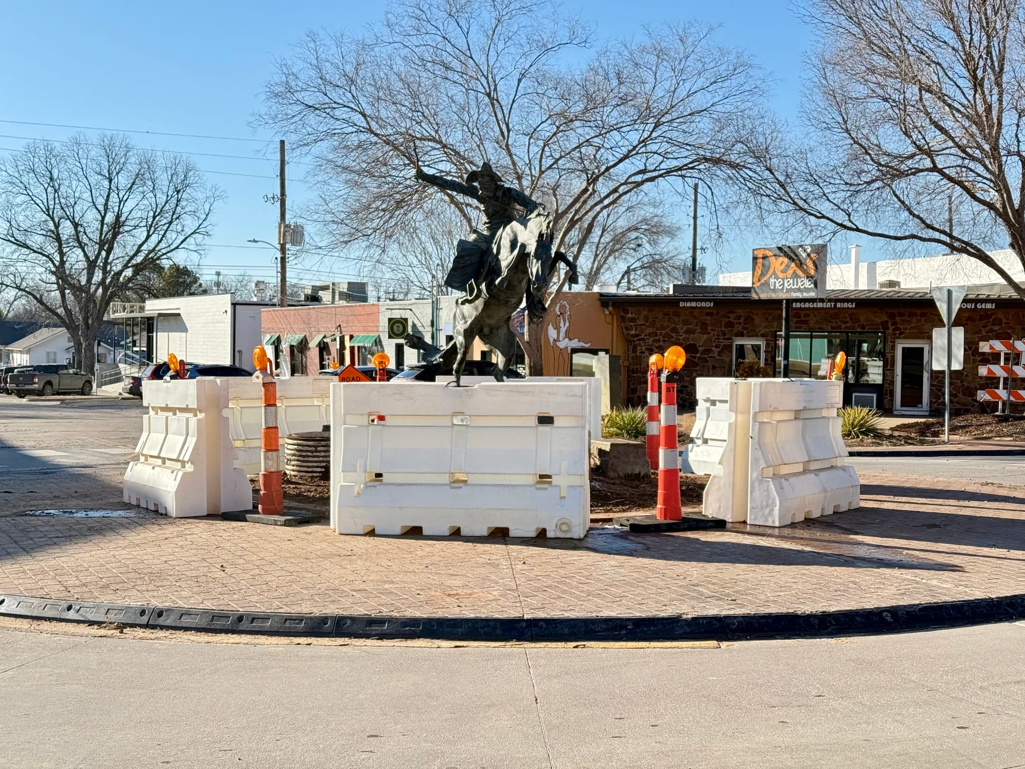 The roundabout, which features a horse and rider statue that has become a landmark for the city, was recently hit "pretty hard," according to City Manager Brady Moore, causing significant damage.