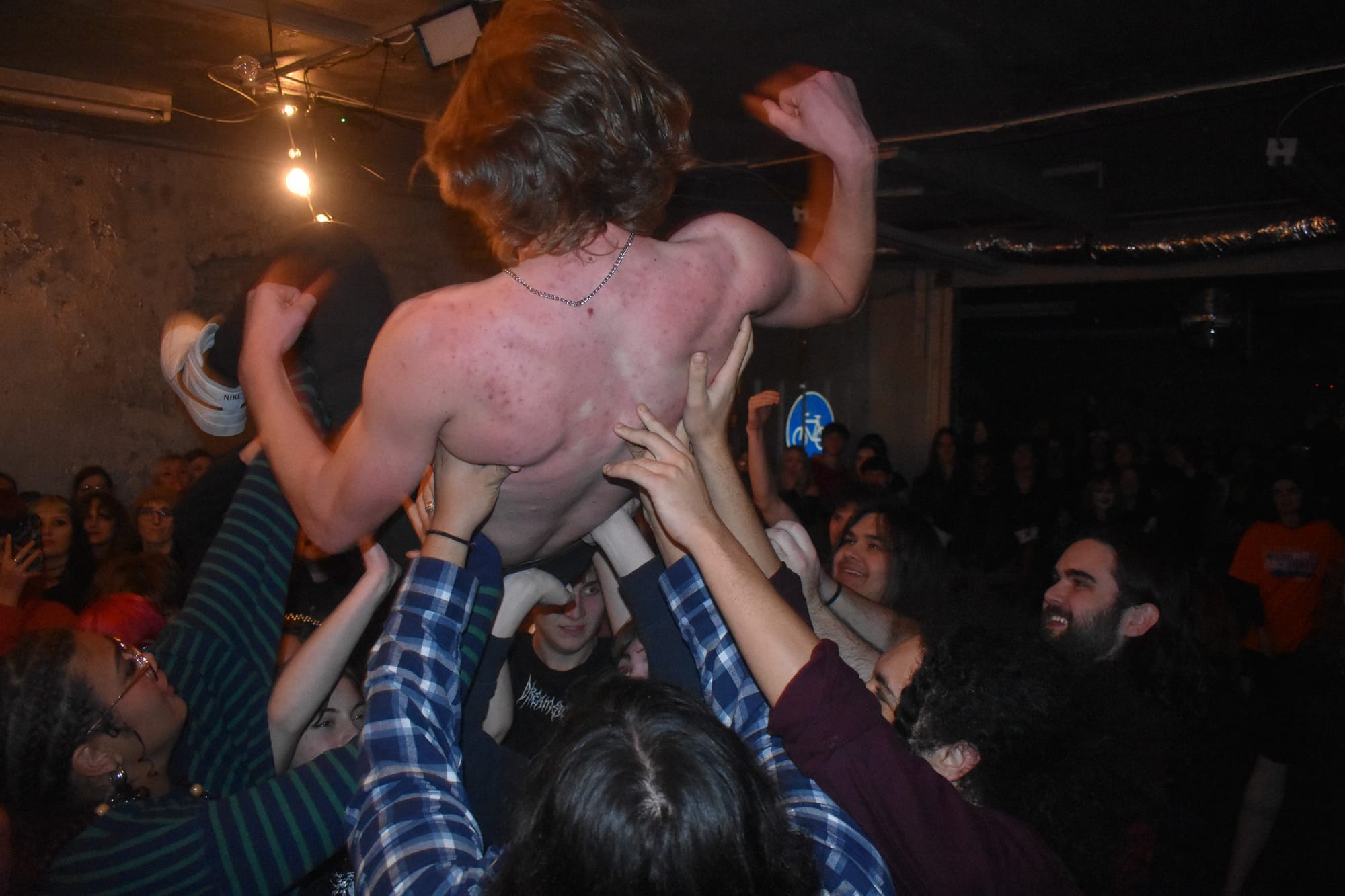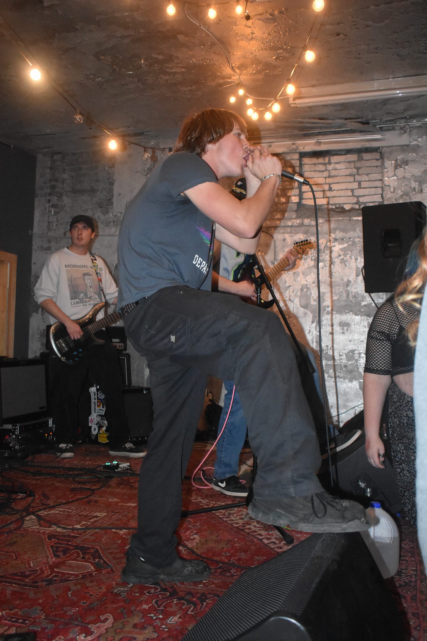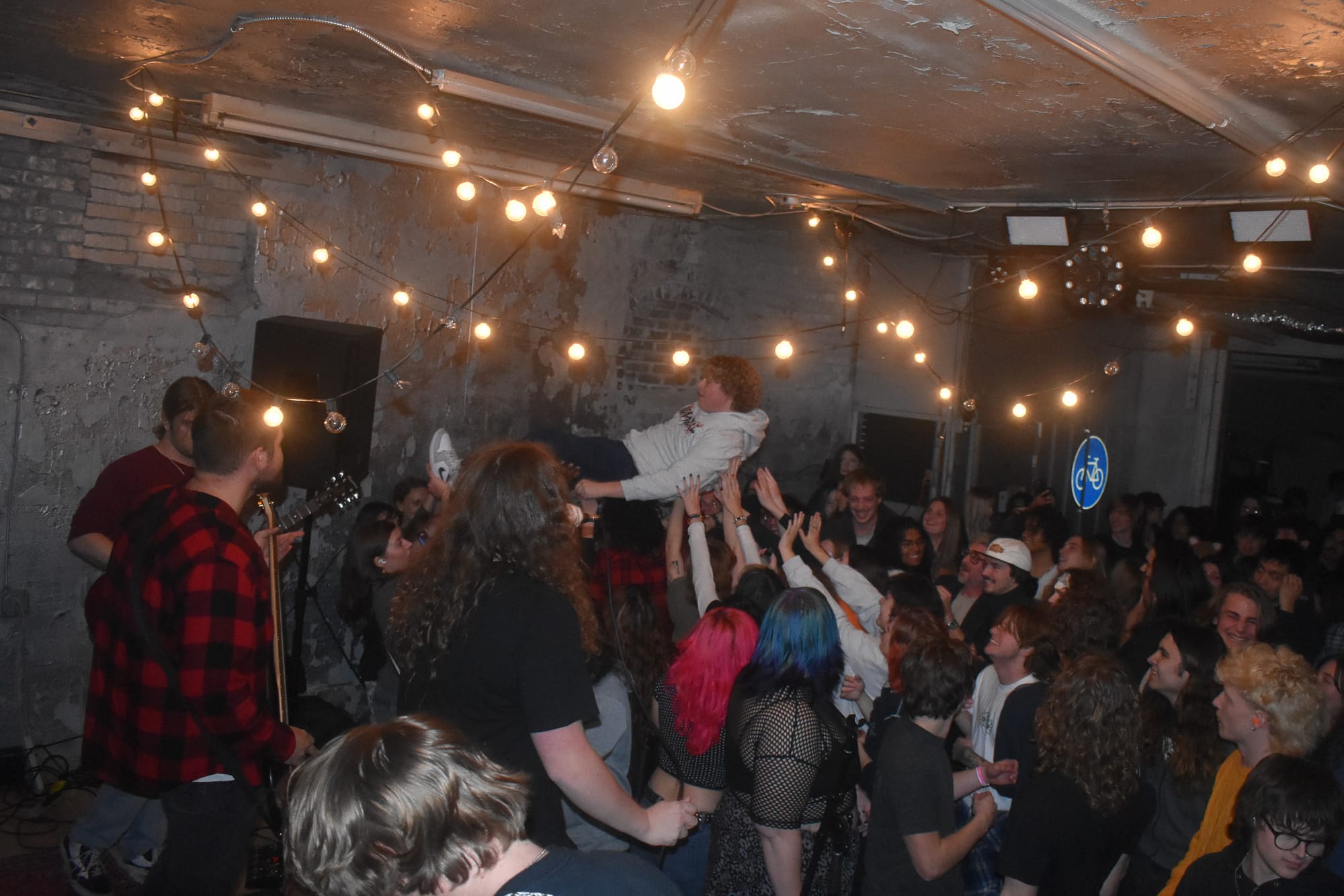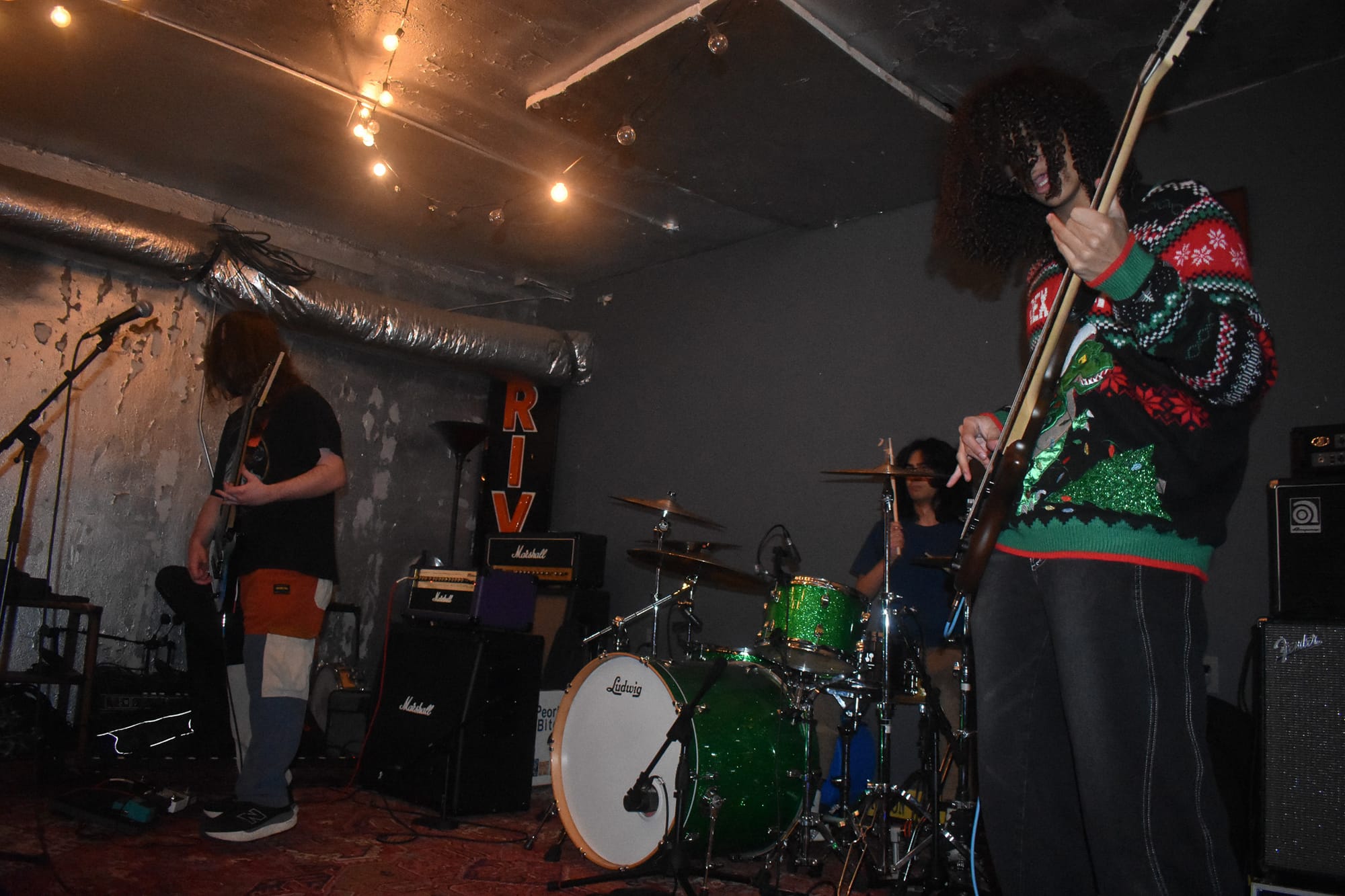 When I arrive at 6:30 p.m. for the doors, there are a few people milling about already. It’s Dec. 6, 2025, a chilly and foggy evening and they’ve got a fire going on the back patio that I can’t see but smell. I’m greeted by Henry, an enthusiastic young man who is excited for the night of music ahead. The first band is already partway through their soundcheck and I can already tell we are in for something fun. The crowd is mostly younger. There is a familiar alt punk look to them that I remember vividly from my childhood in Seattle, WA. A lot of the folks filtering in are friends with the bands, which shows amazing local support and is awesome to see in a newer scene. By 7 p.m., the venue is about half full and the first band EZ4U2SEY is getting on the stage.