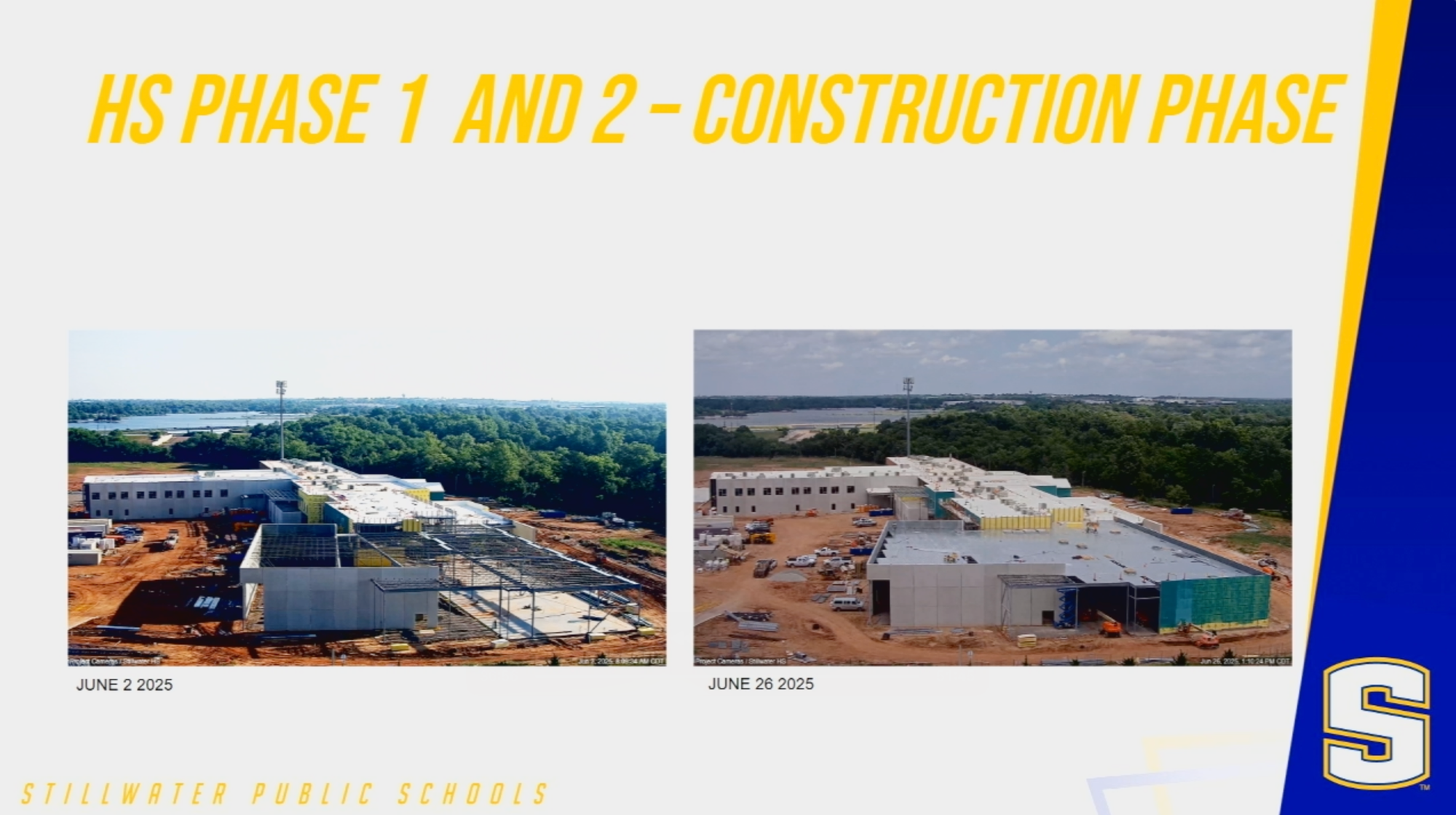 Construction Manager Brian Thomas provided an update on the new high school project, reporting that Phase 1 construction remains on schedule for completion in May 2026. The north wing may be ready for a temporary certificate of occupancy as early as November or December, allowing furniture installation before final completion.