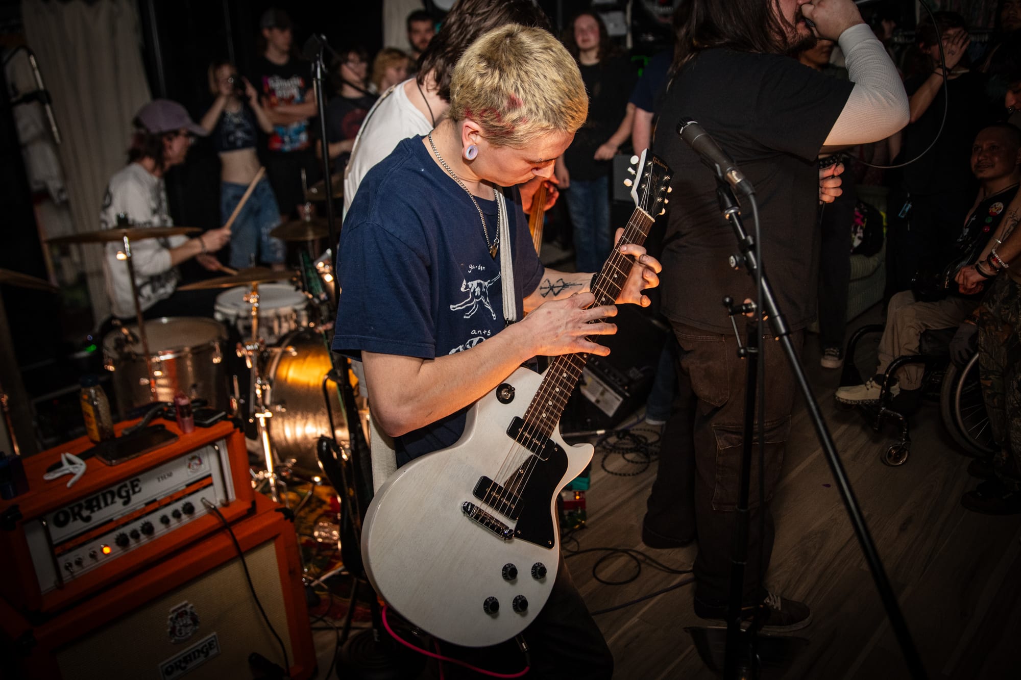 The evening opened with Edge welcoming the crowd and noting that Garden Ants played the very first show at the skateshop. Peoria kicked off the music, debuting a cover of "Crickets Throw Their Voice" by Basement. Fighting Sleep followed — their first performance since November — and introduced a new member, Taj Bright on guitar, joining vocalist Jaron Thompson, guitarist and vocalist Kristian Brooks, drummer and vocalist Kasen Lehenbauer, and bassist Nathan Cantrell. Their more traditional Midwest emo set fit naturally into the evening's momentum.