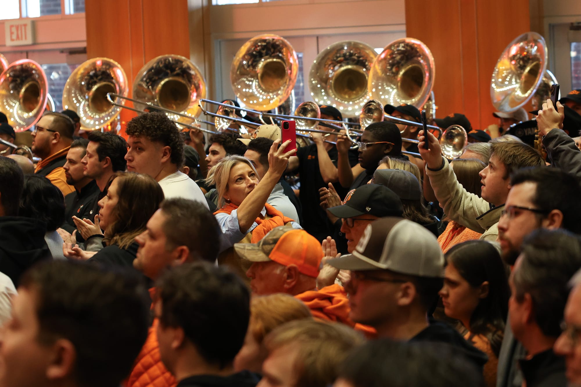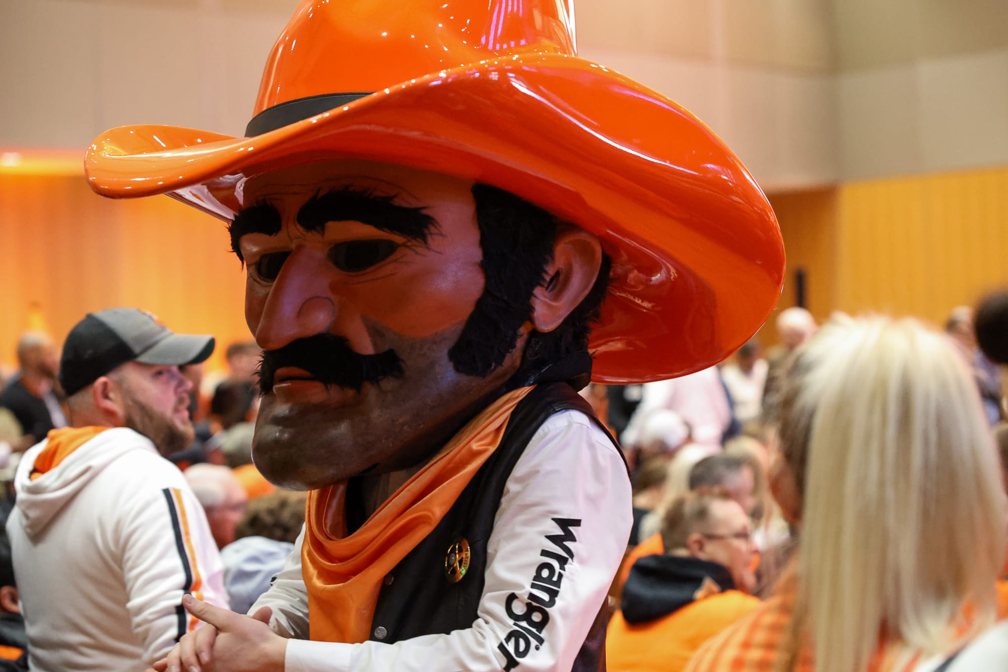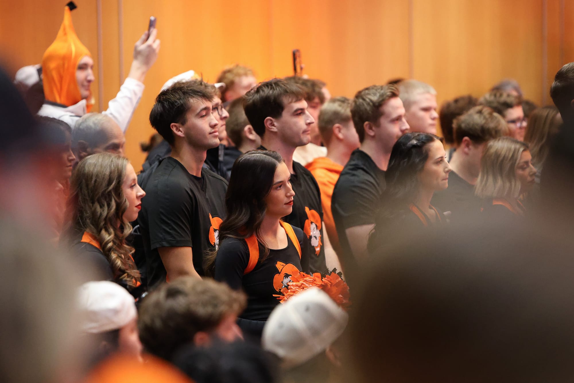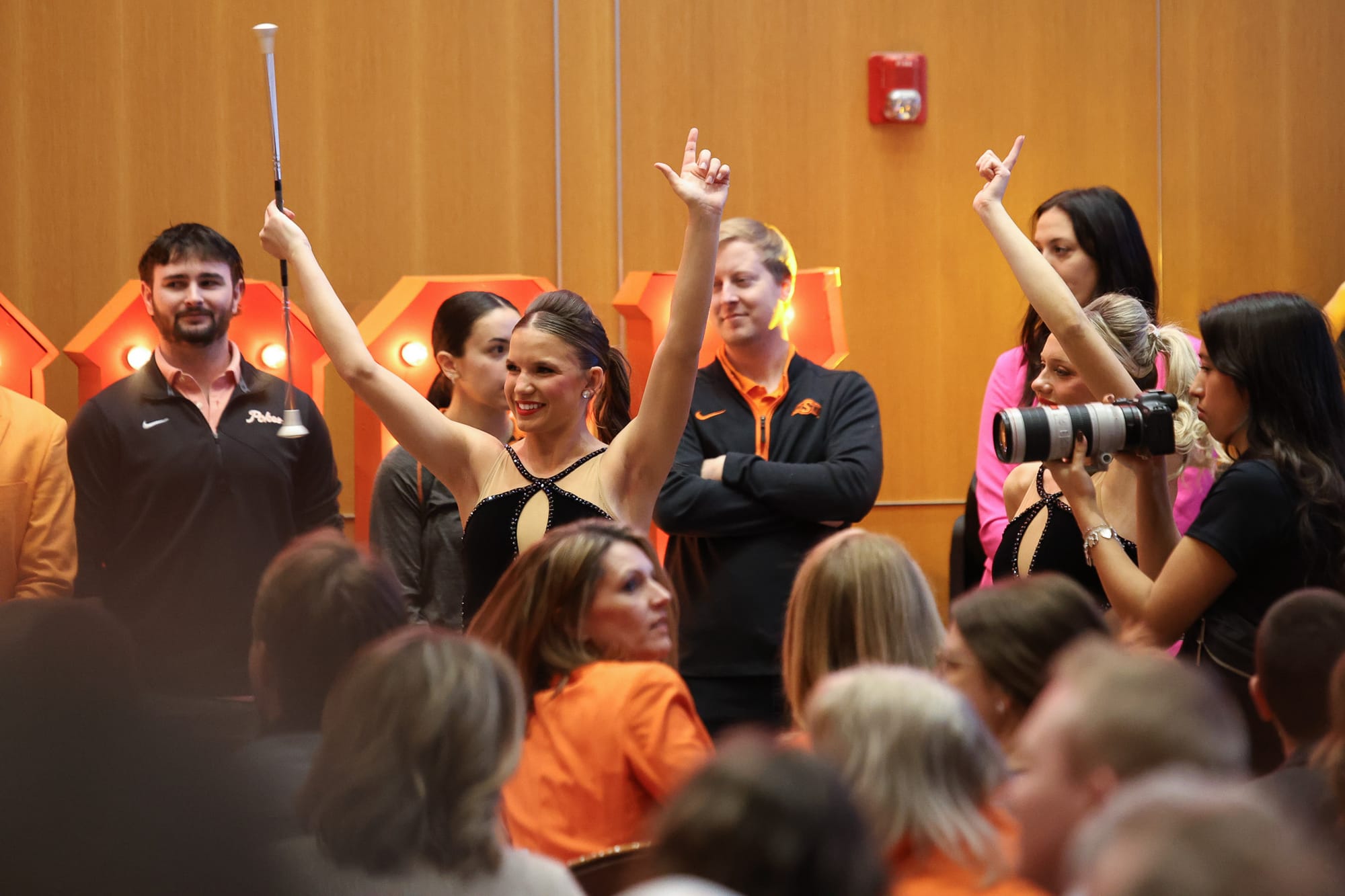 The OSU marching band, baton twirlers, cheerleaders and mascot Pistol Pete were among the large crowd that packed the OSU Alumni Center in Stillwater for new head football coach Eric Morris' introductory press conference Monday, Dec. 8, 2025. The event drew students, alumni, boosters and fans eager to welcome Morris as the Cowboys' first new head coach in over 20 years. – Photos by Chris Peters