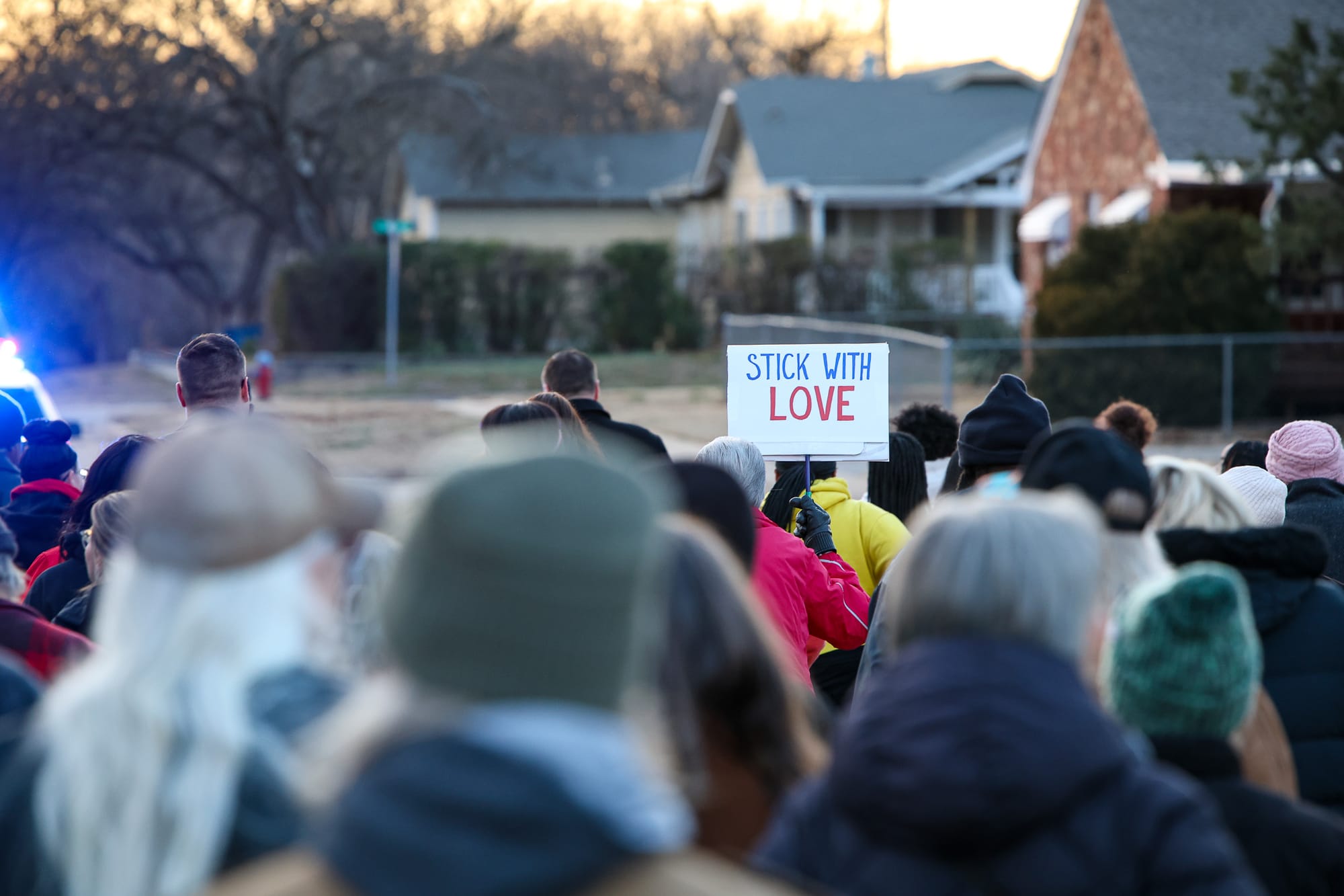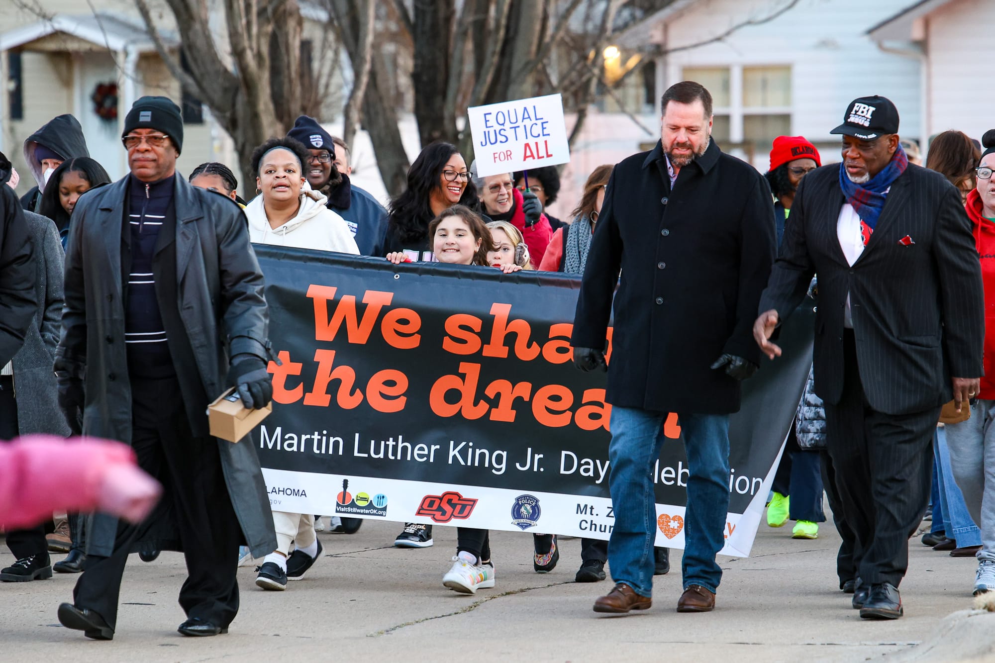 Community members, church leaders, and city officials march one-third of a mile from Stillwater Public Library to Mt. Zion Baptist Church on Monday January 19, 2026, during Stillwater's Martin Luther King Jr. Day unity march. Participants carried a banner reading "We share the dream" and signs promoting love and equality before gathering at the church for a youth-led program celebrating Dr. King's legacy. – Photos by Chris Peters